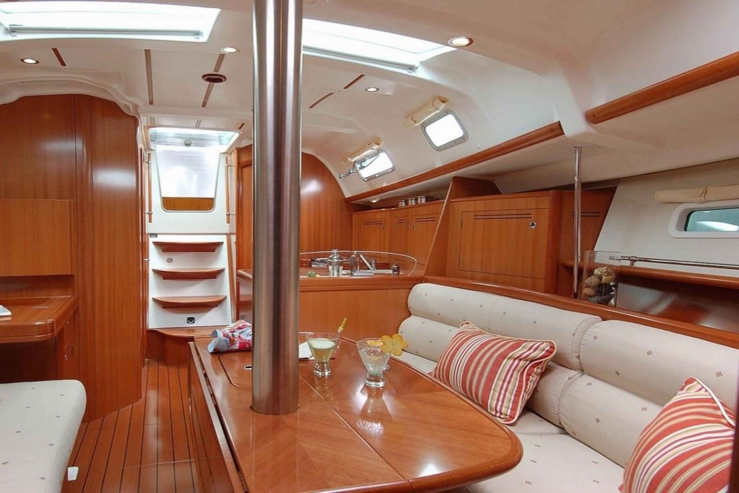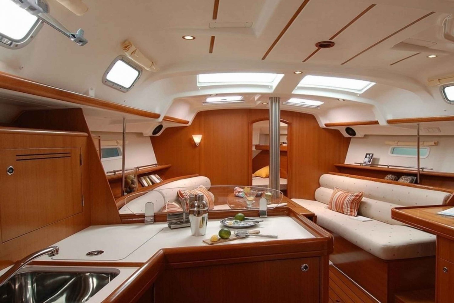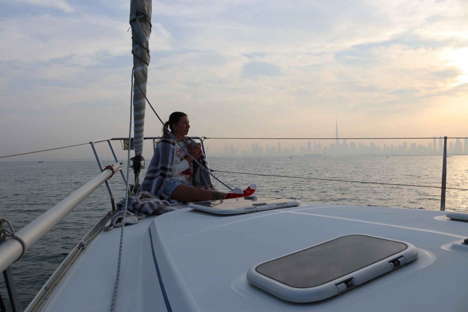 Unikt sejleventyr ombord på en fransk sejlbåd med udsigt over Burj Khalifa og Dubai skyline, svømning og vandsjov på åbent hav.
