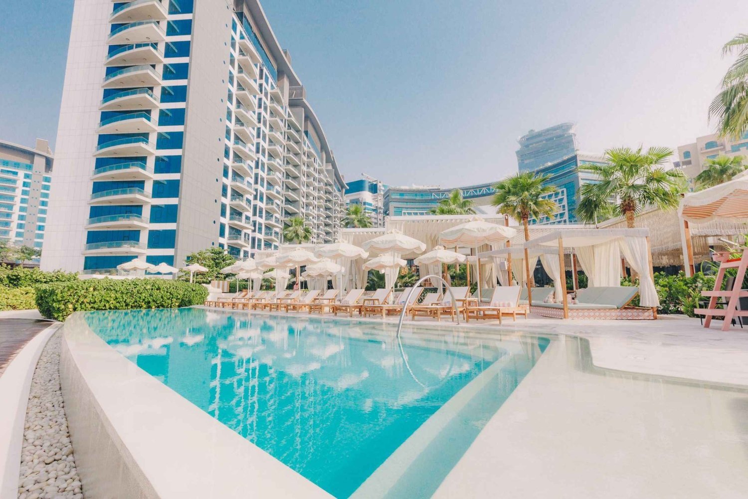Slap af med stil på The 305 Beach Club i West Palm Beach Dubai med en liggestol til 2 personer, en flaske Prosecco og en frugtplade. Nyd den livlige atmosfære og udsigten over Dubai Marina-skyline.
