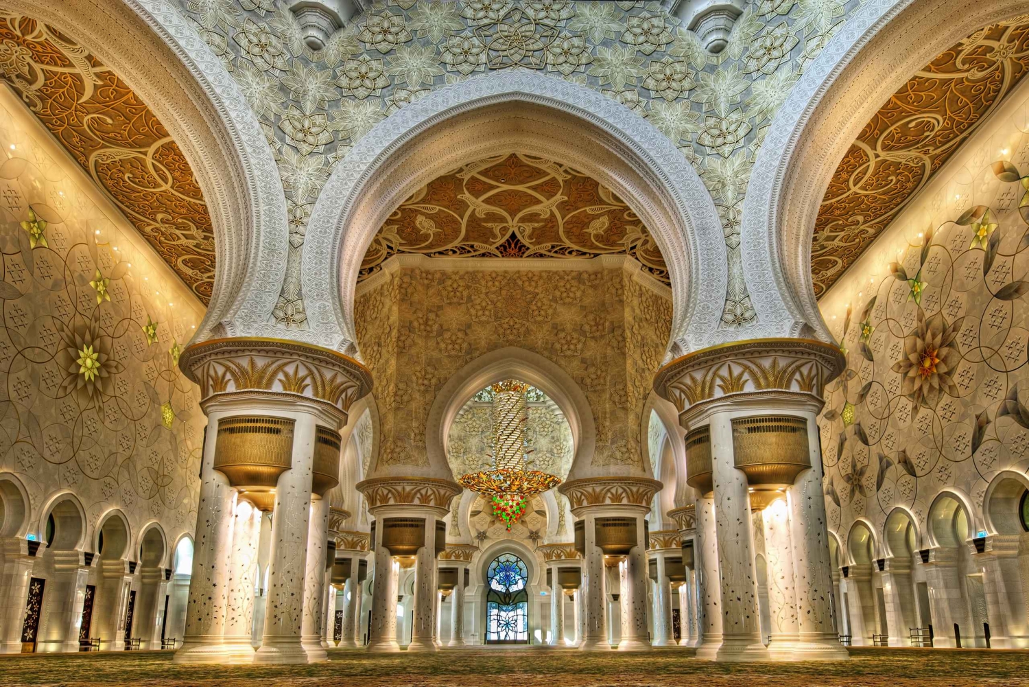 Gå forbi verdens største håndvævede tæppe, blomsterdesign i marmormosaik, en fantastisk lysekrone og glaspaneler besat med Swarovski-krystaller. Se de reflekterende bassiner, der omgiver moskéen, og som gør den endnu smukkere.