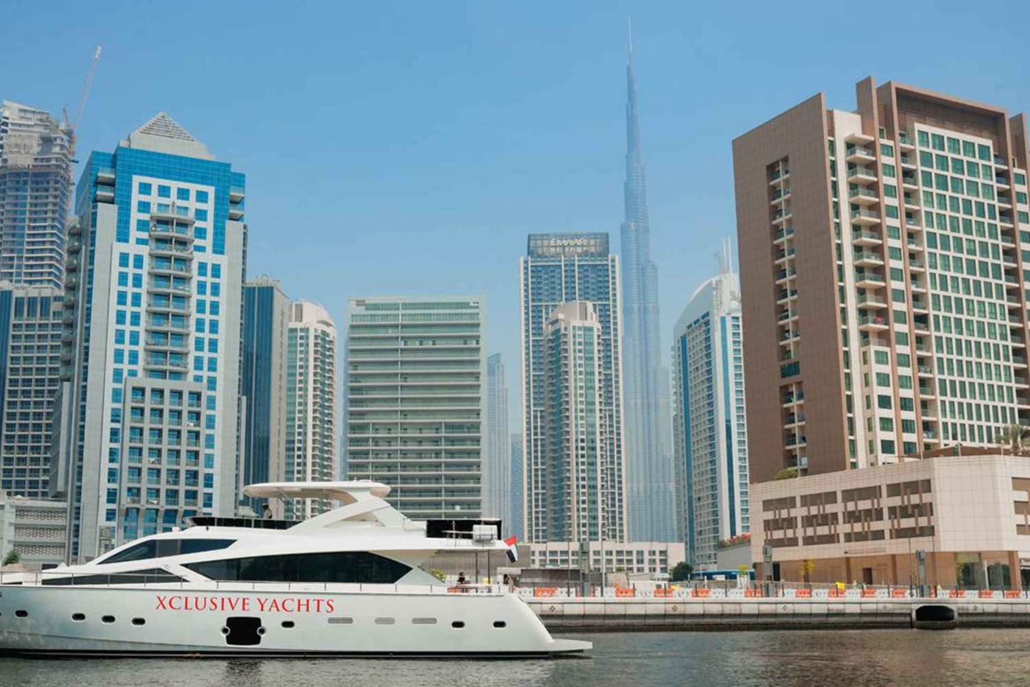 Stig ombord på en elegant, moderne yacht, og sejl gennem hjertet af byen, hvor arkitektonisk elegance møder rolige farvande. Mens yachten glider blidt gennem kanalen, kan du nyde en betagende udsigt over Downtown Dubai, den verdensberømte Burj Khalifa og den oplyste Business Bay Bridge.