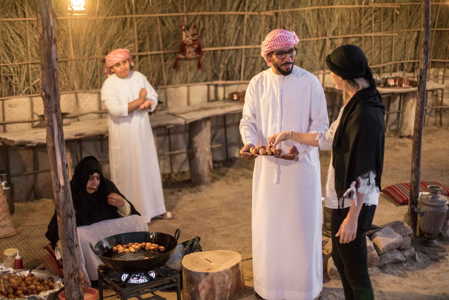 Kehrt ins Dorf zurück und bewundert die Bauweise aus vielen natürlichen Materialien wie Ziegenhaar. Schaut einem Emiratier bei der Zubereitung von traditionellem arabischem Kaffee, Brot und Luqaimat zu. Genießt die reichhaltigen Aromen, während ihr den Sonnenuntergang über der Wüste beobachtet. Macht Fotos inmitten der endlosen Wellen der Dünen. Schaut euch die Zubereitung traditioneller emiratischer Gerichte live an, darunter eine Emiratierin, die Brot und süße Knödel zubereitet. Nimm an einem leckeren BBQ teil und hör dir von deinem Guide echte Geschichten aus dem alten Beduinenleben an. Genieß nach dem Abendessen traditionelle Tanzvorführungen, die moderne und traditionelle folkloristische Stile verbinden. Wenn du möchtest, kannst du dich arabisch stylen lassen und Fotos mit dem majestätischen Falken machen. Schau nach dem Erlöschen der Lichter des Camps zu den Sternen hinauf und spüre die Ruhe der Wüstennacht, die dich umgibt.