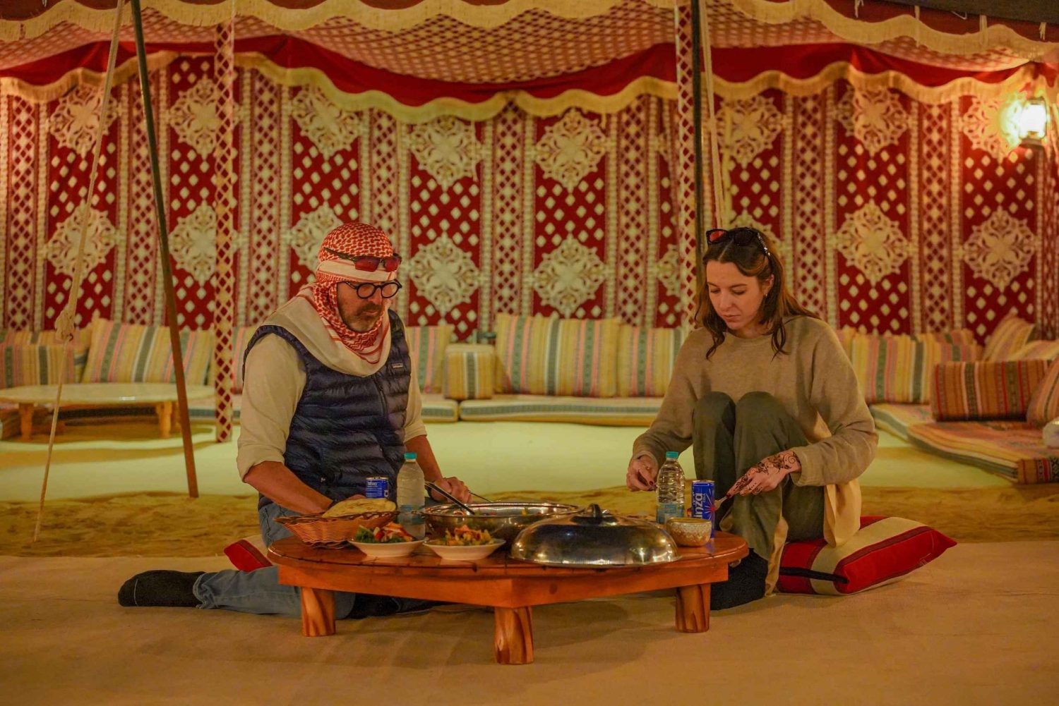 Erkunde die Wüstendünen auf einem Kamel und hör dir unterwegs Geschichten aus dem Leben der Beduinen an. Kehre zum Beduinendorf zurück, um ein authentisches Essen zu genießen und traditionelle Unterhaltung zu erleben. Nach dem Erlöschen der Lichter im Camp kannst du dann mit einem Teleskop die Sterne beobachten und die ruhige Wüstennacht um dich herum spüren.