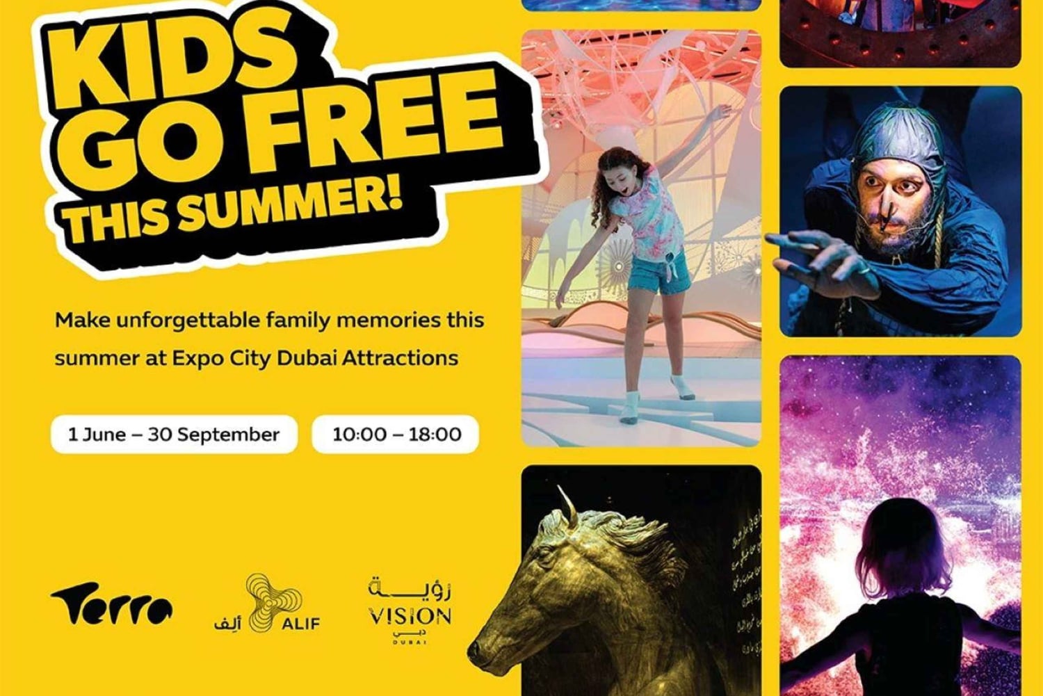 Entdecke den Attractions Pass: Hol dir Zugang zu Terra, Alif und Vision! Kinder haben freien Eintritt Mach diesen Sommer zu etwas ganz Besonderem mit diesem Angebot für alle Attraktionen in der Expo City Dubai vom 1. Juni bis 30. September!