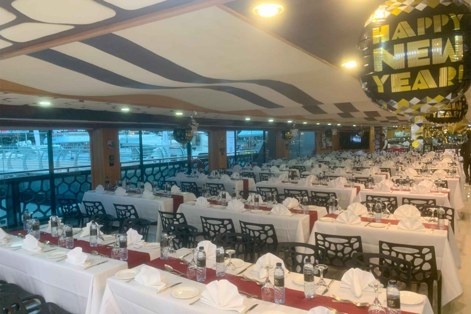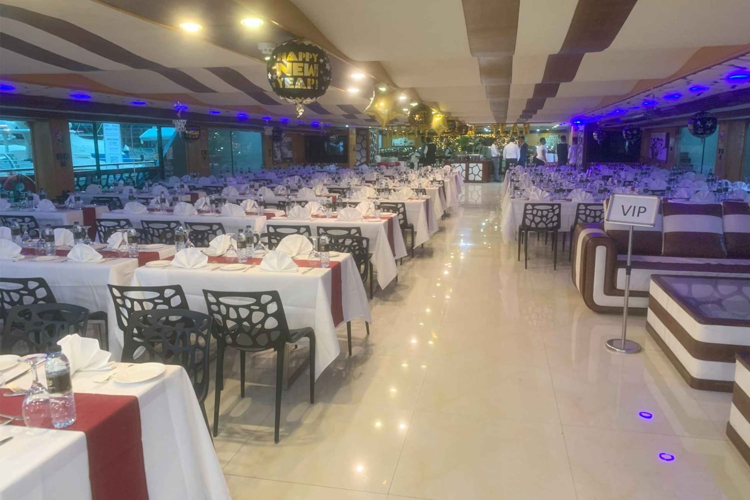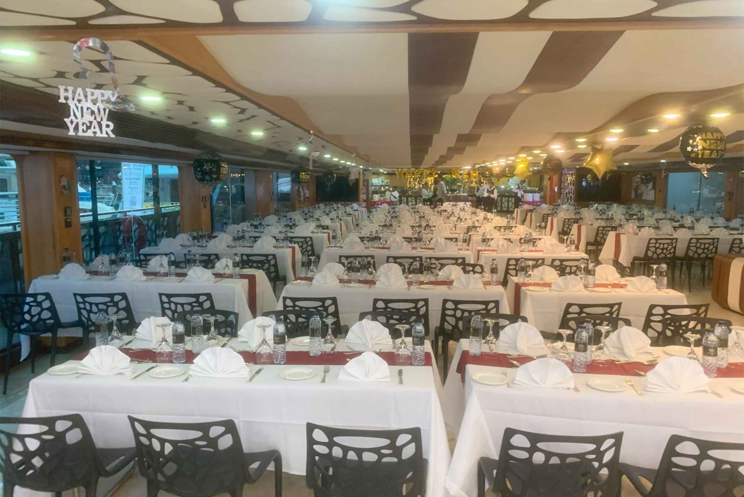 Komm an Bord einer komfortablen Lotus-Megayacht und erlebe ein einzigartiges Neujahrserlebnis. Verbessere deine Kreuzfahrt mit der VIP-Option, die dir einen Parkservice, Check-in in der VIP-Lounge, bevorzugtes Einsteigen und Flaschenservice an deinem reservierten Tisch auf dem Oberdeck bietet, oder wähle einen freien Platz auf dem Ober- oder Hauptdeck.