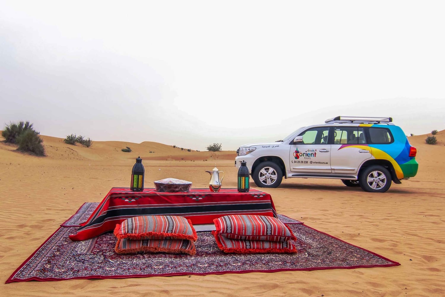 4WD Jeep Fahrt in die Wüste für den faszinierendsten Blick auf den Sonnenaufgang. Genieße ruhige Momente mit deinen Partnern auf dem Kamel. Genieße ein traditionelles arabisches Frühstück in niedriger Sitzposition.