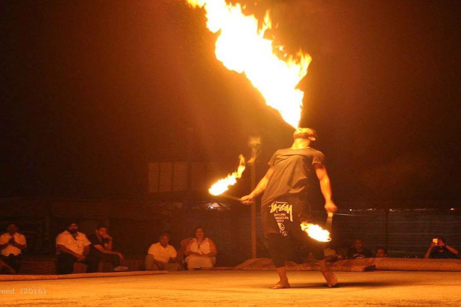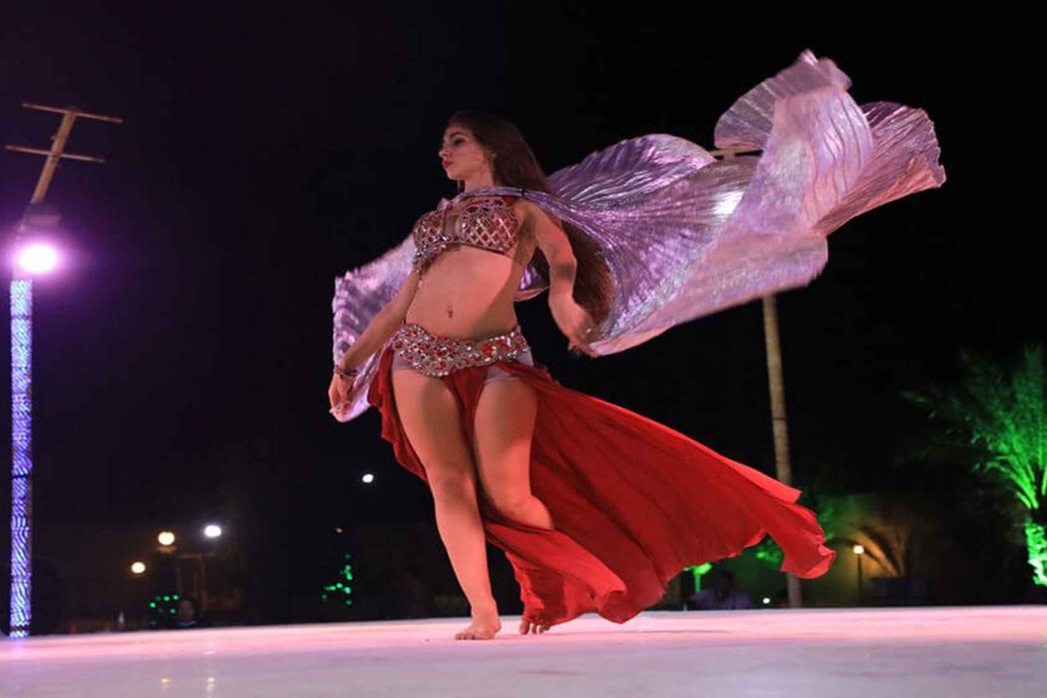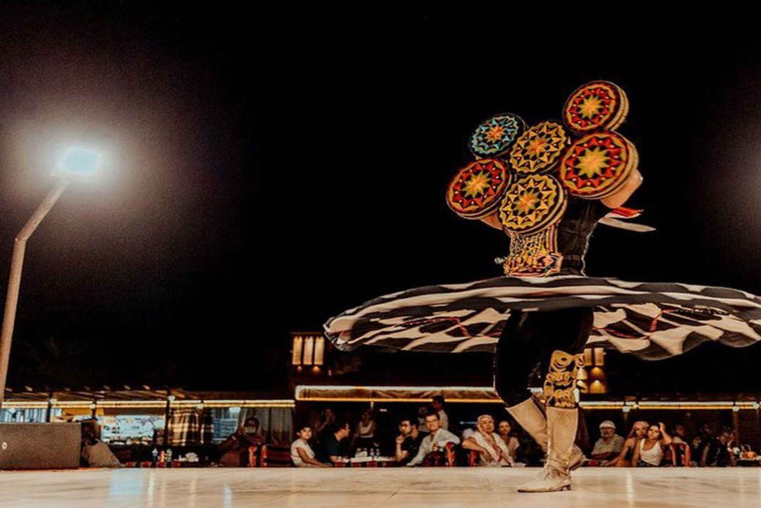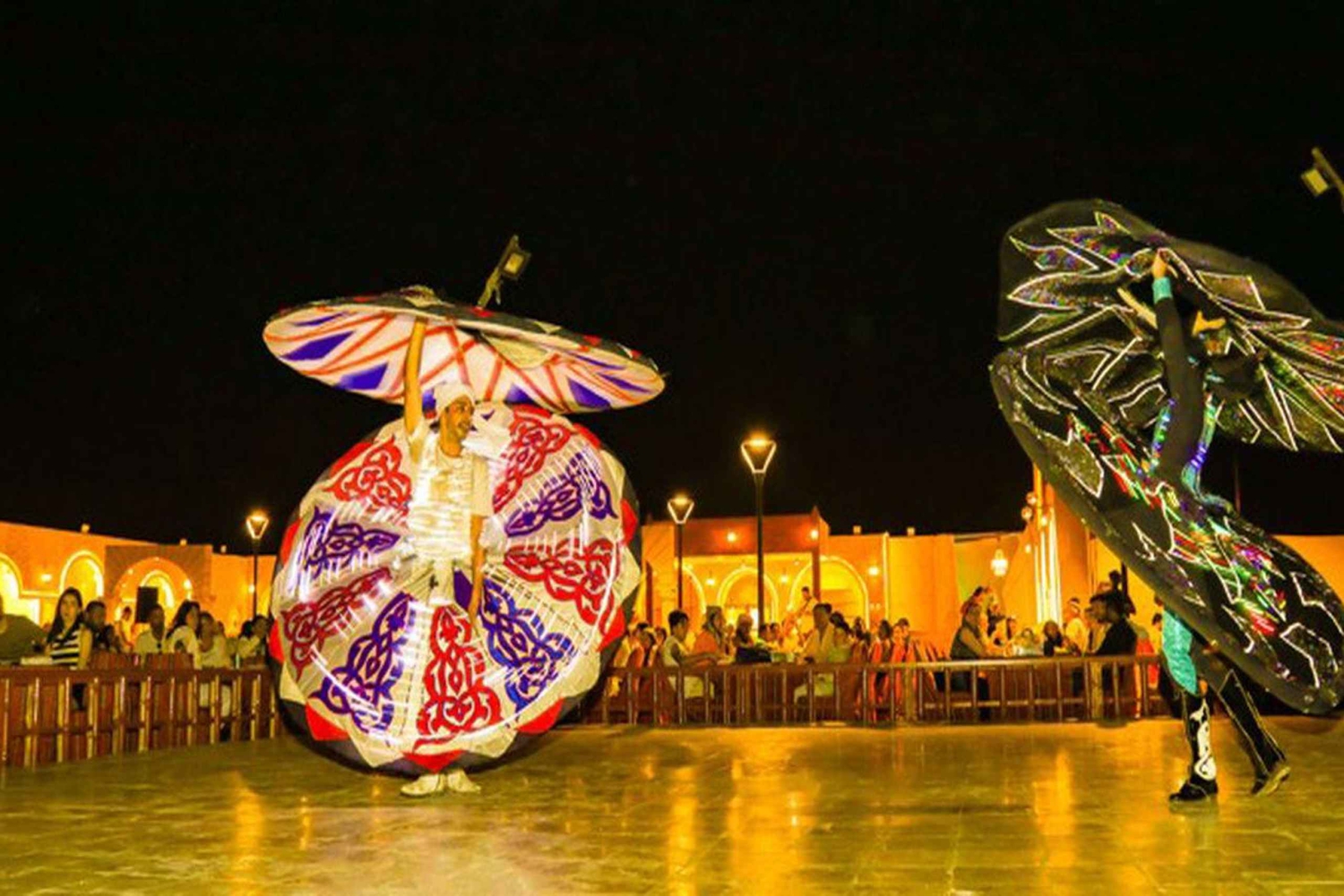 Henna-Malerei. Unbegrenzt alkoholfreie Getränke, Tee, Kaffee, Wasser. BBQ-Abendbuffet mit vegetarischen und nicht-vegetarischen Gerichten in einem klimatisierten Raum. Privater VIP-Sitzplatz im Premium-Bereich mit Shisha-Live-Shows. Bauchtanz, Feuershow, Tanura-Show, Ayala-Show, Dabka-Show, Eskandrani-Show, afrikanischer Tanz, Popet-Show.