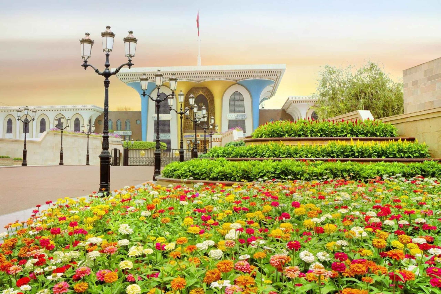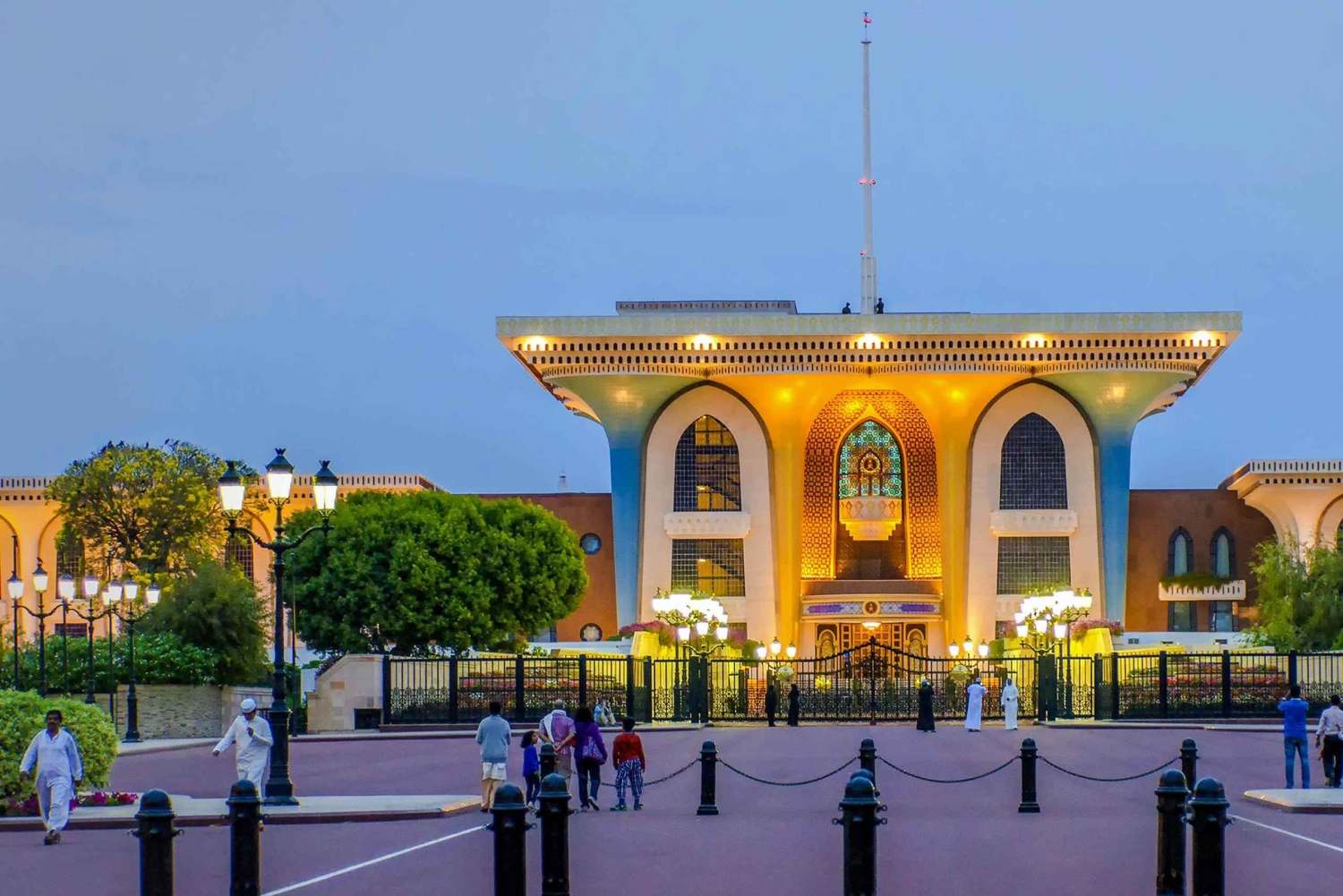 Sultan's Place oder Qasr Al Alam (Flaggenpalast) ist eine der wichtigsten Residenzen von Sultan Qaboos Bin Said. Eine gehisste omanische Flagge am Eingang zeigt die Anwesenheit des Sultans im Palast an.