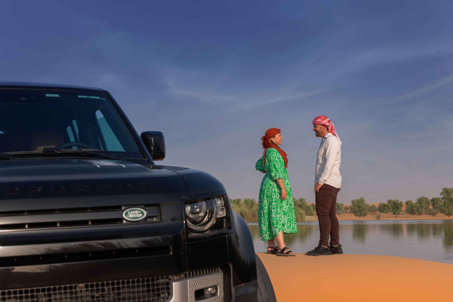 La experiencia se eleva con un safari por la naturaleza en un lujoso Land Rover Defender y un desayuno gourmet en el mundialmente conocido Al Maha Desert Resort & Spa.