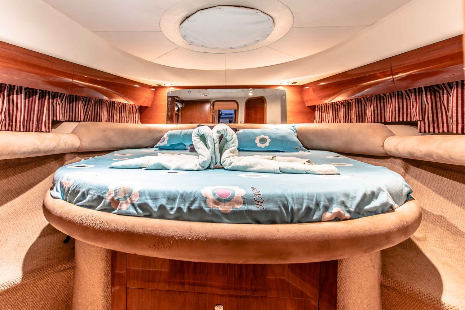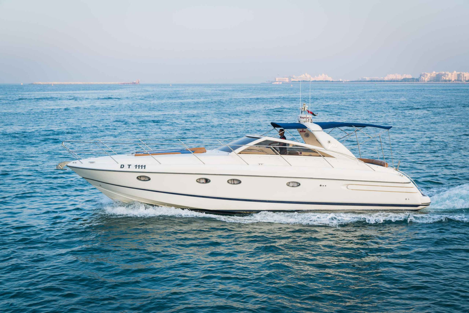 Meet your private skipper at the Dubai Marina and board the gleaming, 42-foot private motor yacht. Amenities include a spacious sun deck, seating area, comfortable indoor saloon, cabins, a kitchen, and a washroom.