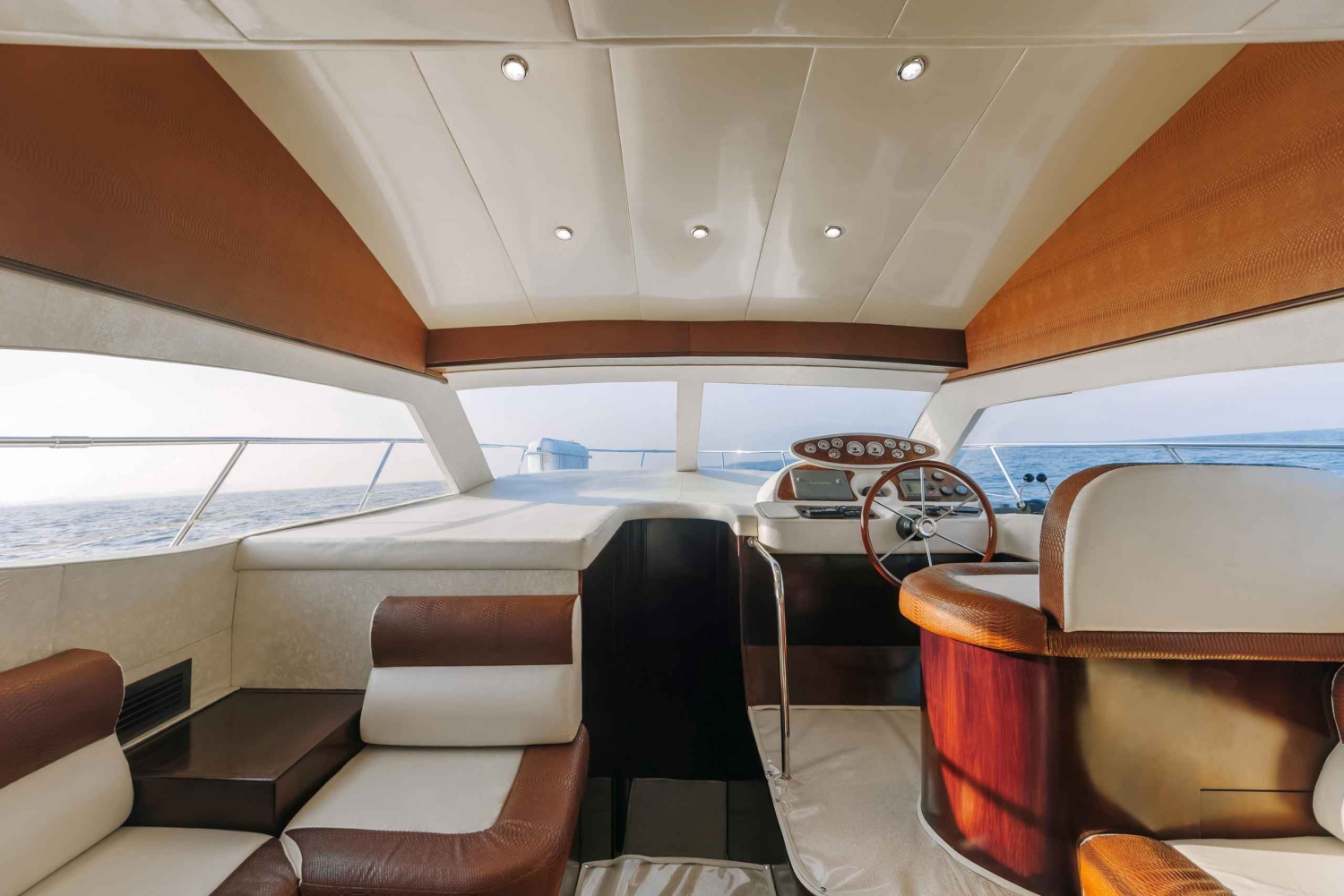If you are aiming to rent a yacht in Dubai for a romantic escape or for an original celebration with a group of invitees, our 50ft yacht is an excellent choice for you. This is where luxury begins. The below deck consists of a large living room and a bedroom with a washroom. The lounge space, which includes a small kitchen, was designed specifically for relaxing, sipping refreshments, and listening to music while floating on the sea. Watch the Dubai skyline from the sundeck, or simply relax and enjoy the sunset from the outside seating area.