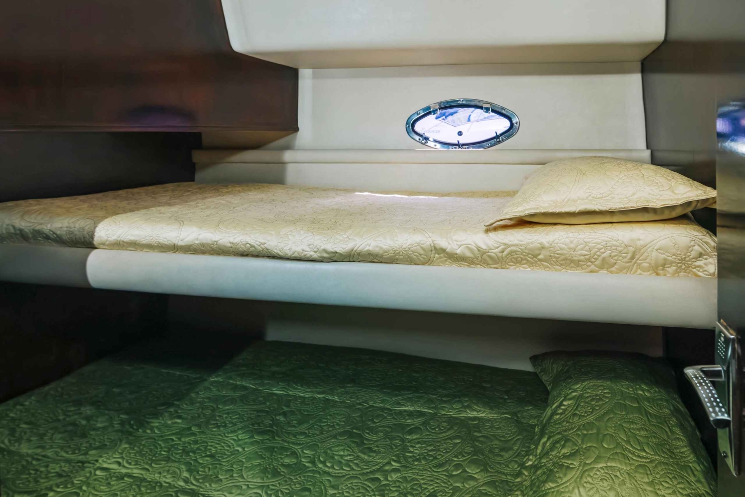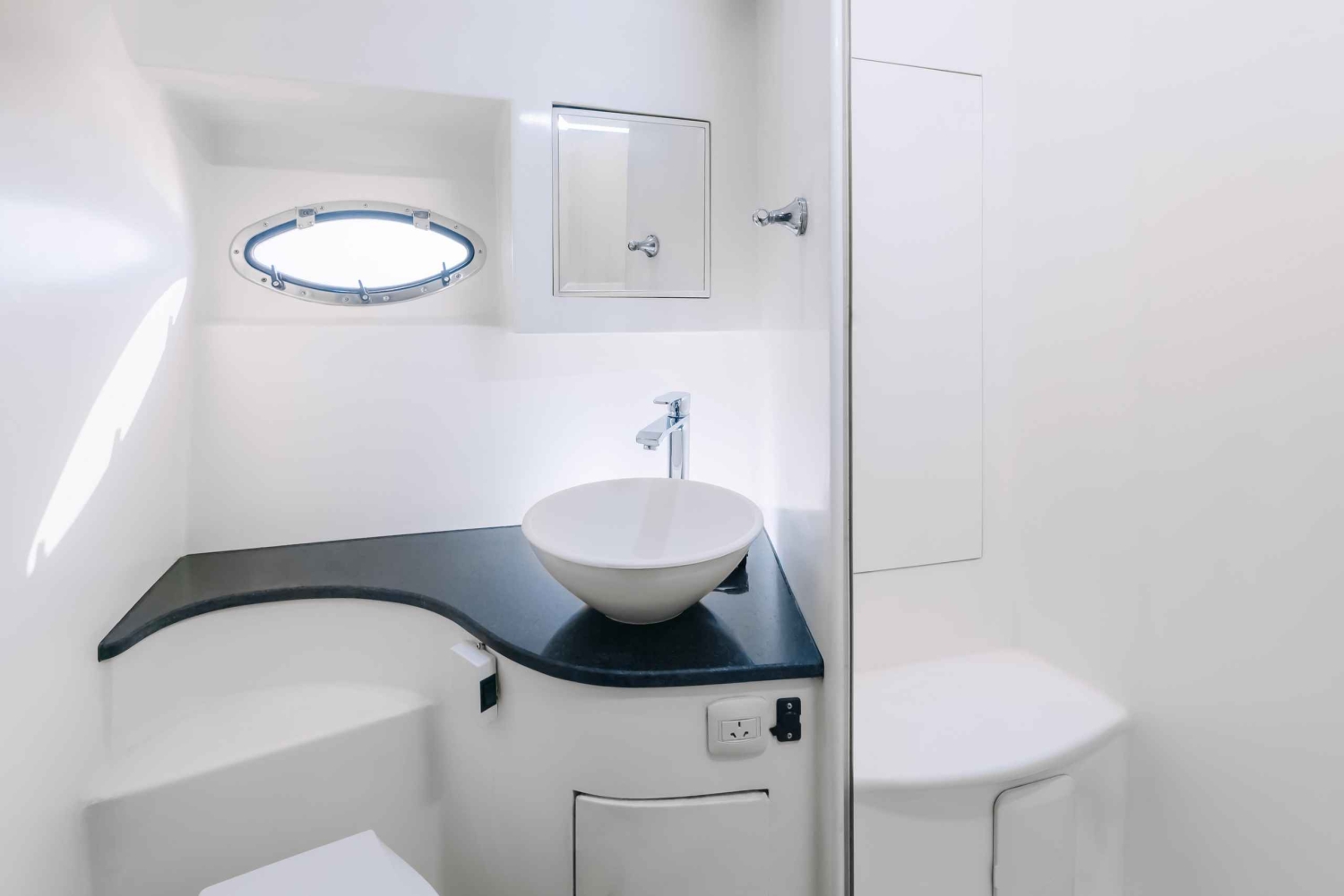 A 50ft yacht in Dubai that offers a luxurious experience with a capacity for up to 19 guests. Amenities include a living room, bedroom with a washroom, fully-equipped kitchen and outdoor seating area.