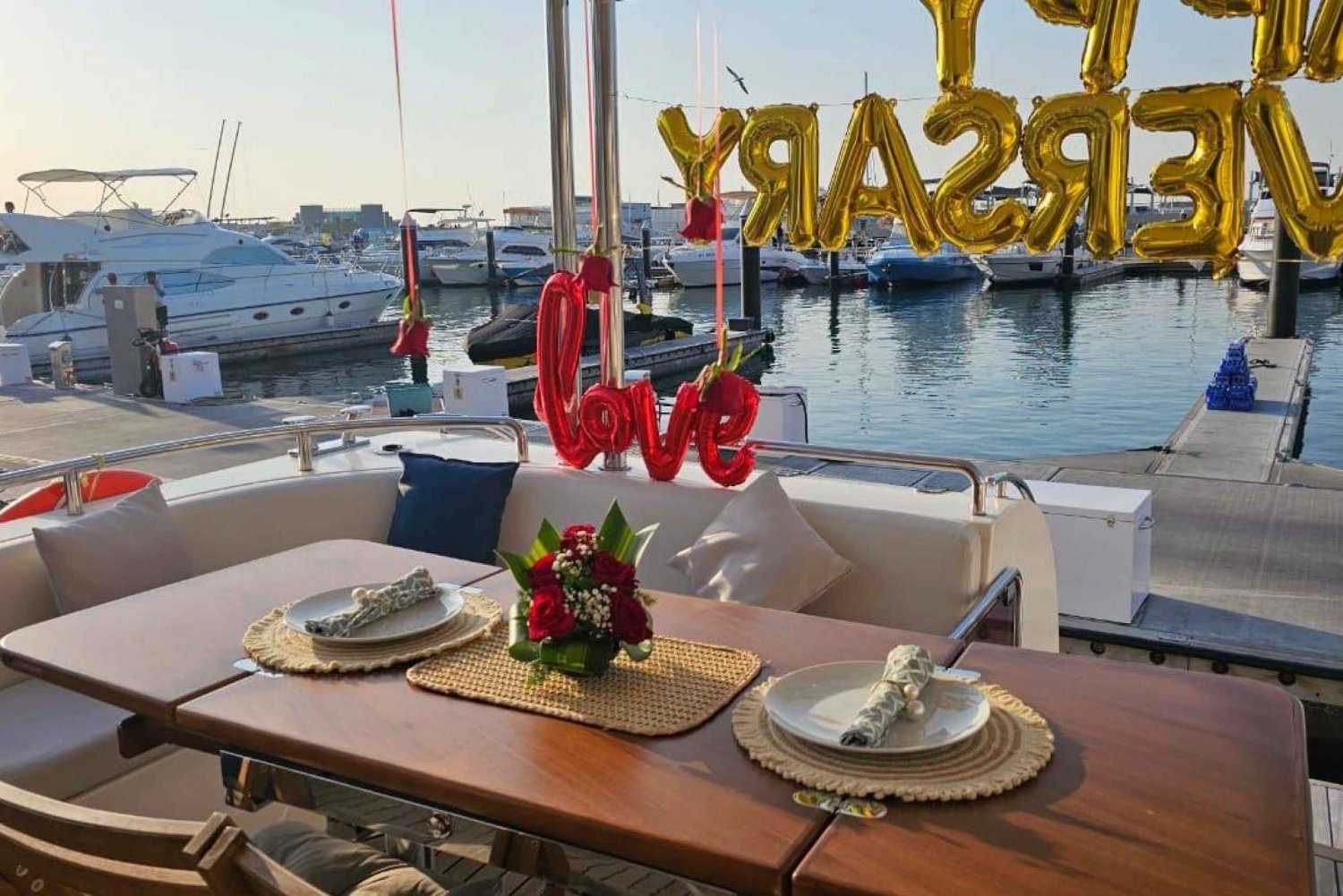 Step aboard our luxurious yacht in Dubai and embark on an enchanting journey of romance and indulgence. As you set sail, you'll be greeted by the stunning panoramic views of Dubai's iconic skyline, bathed in the golden hues of the setting sun.