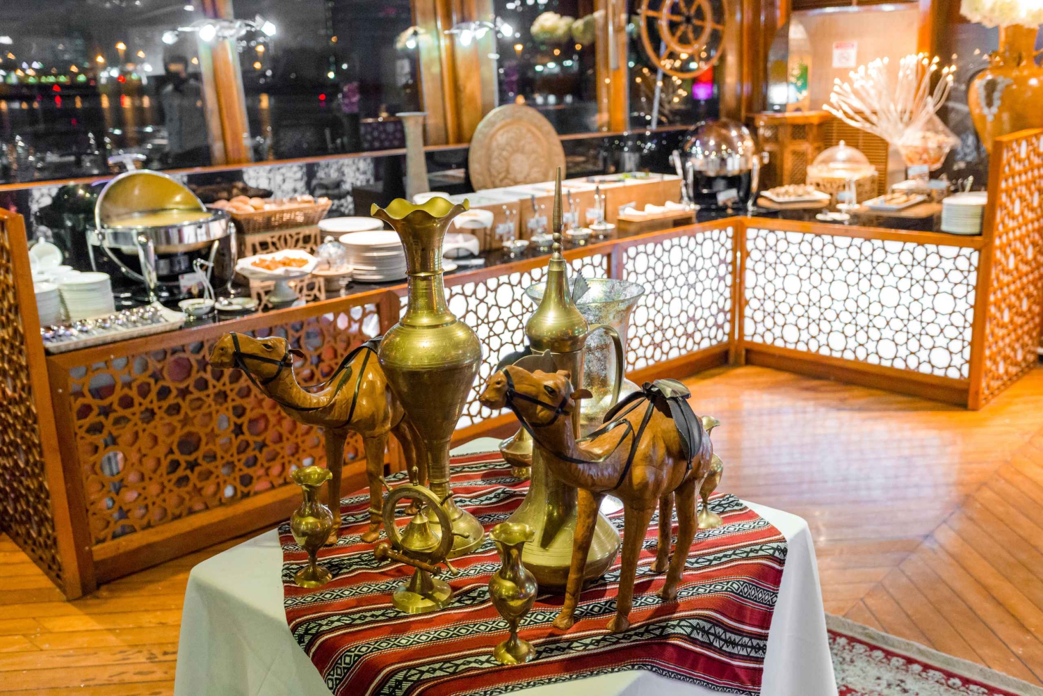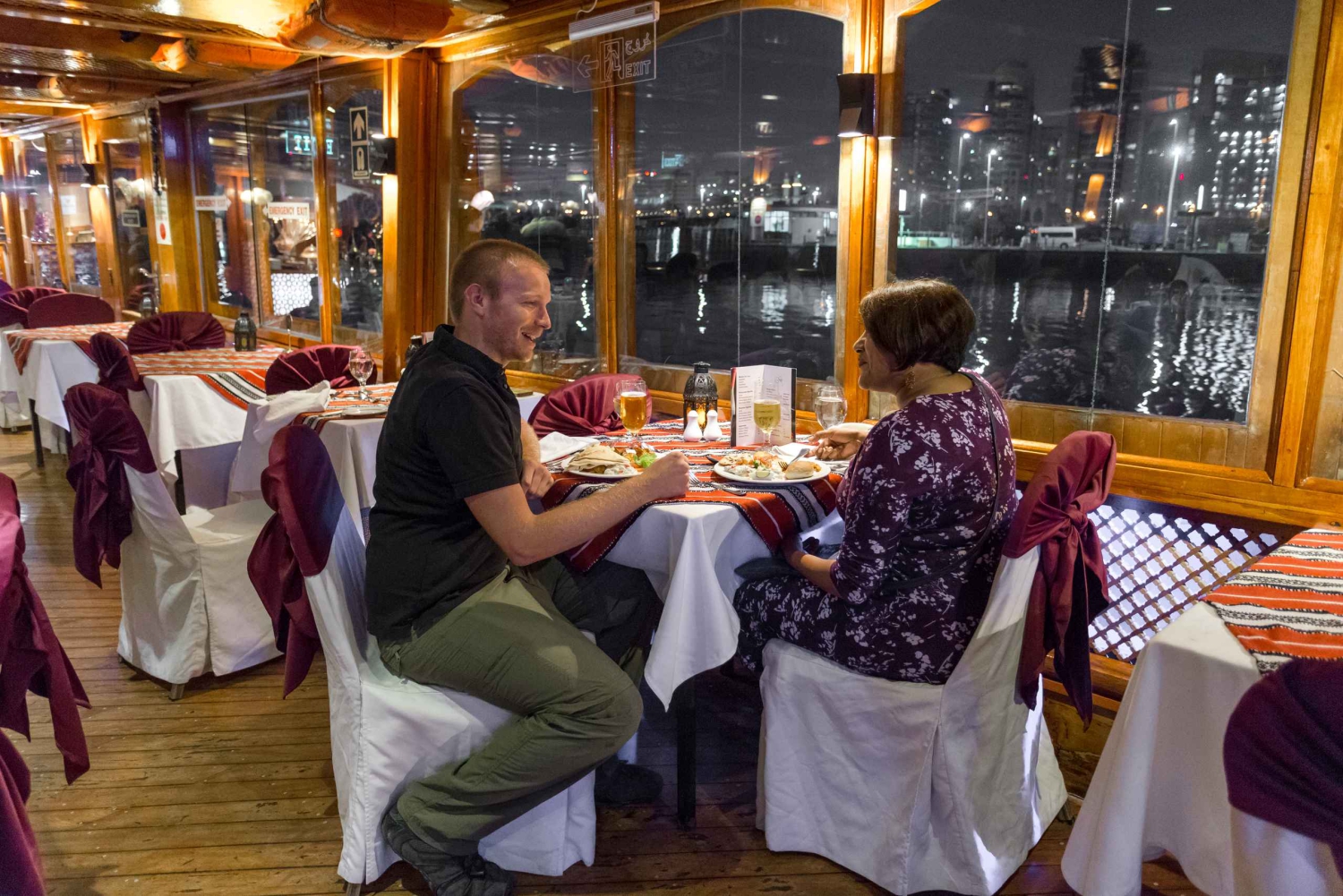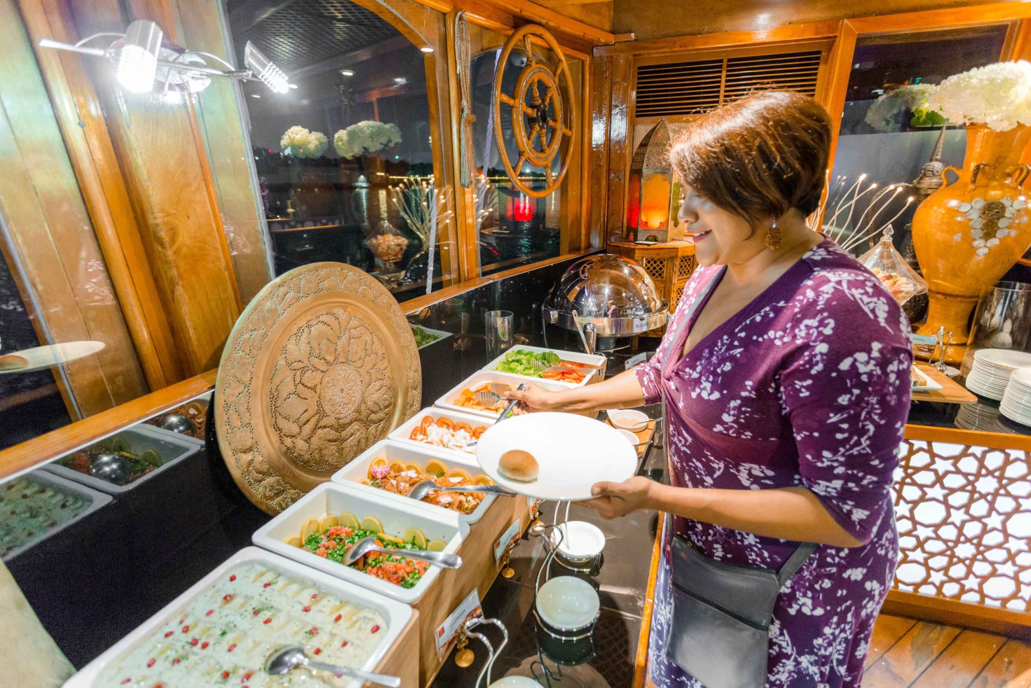 Kun lähdette liikkeelle, liukuu ohi Dubain upeasti valaistun yöllisen horisontin, ja nautitte arabialaisia ja kansainvälisiä erikoisuuksia mukavasti laivan ruokailutilassa.