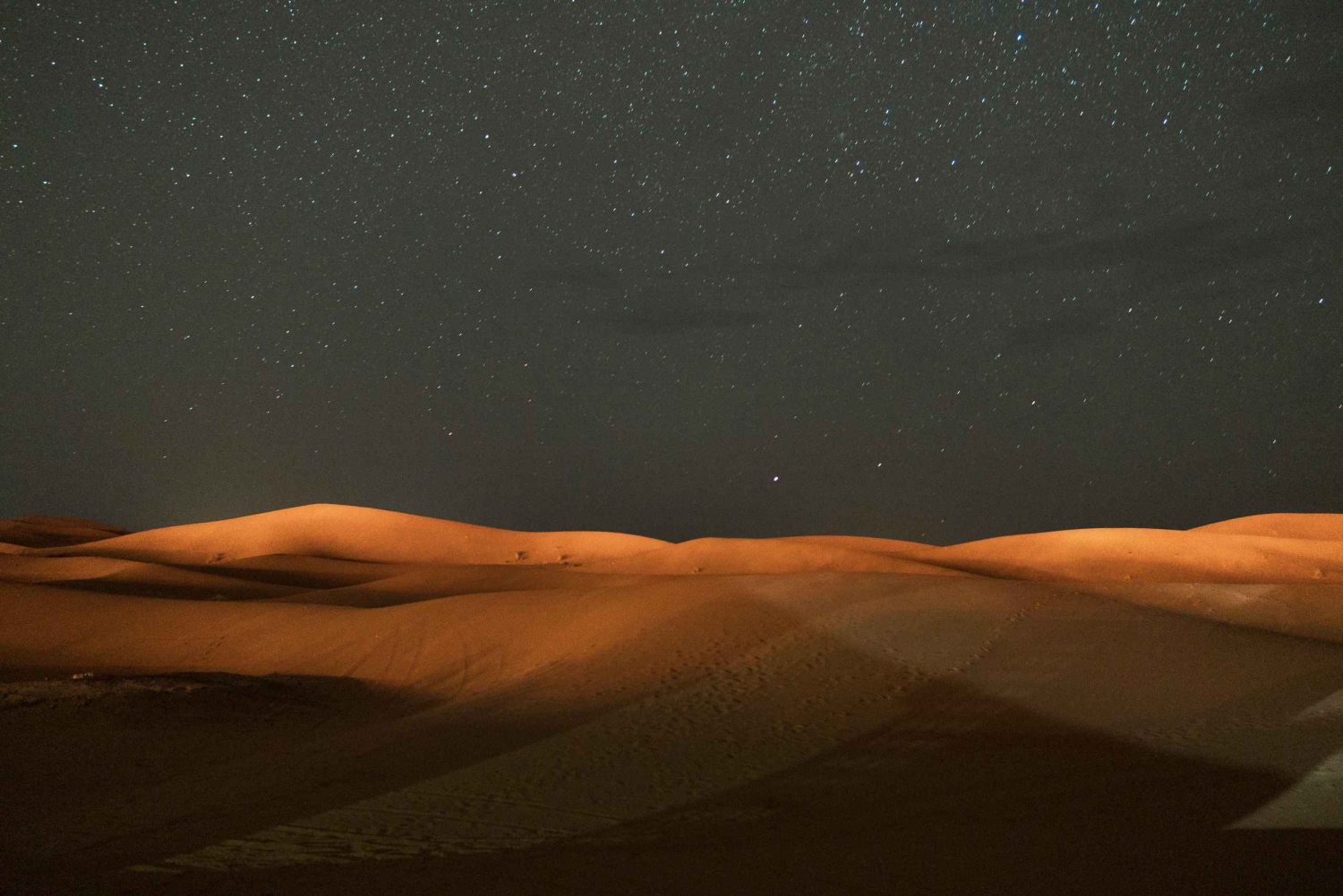 Sitten kävele pimeässä lisäjännityksen vuoksi (täydellinen Instagramiin). Saat nähdä vehreyttä keskellä aavikkoa, mikä luo uskomattomia kuvia ja muistoja. Seikkailu jatkuu yöllisellä dyynekävelyllä, jossa saatat nähdä aavikolla eläimiä ja lintuja, kuten sulokkaita riikinkukkoja, flamingoja, muuttolintuja, helmikanat, sorsia, gaselleja ja aavikkoriisamaisia.