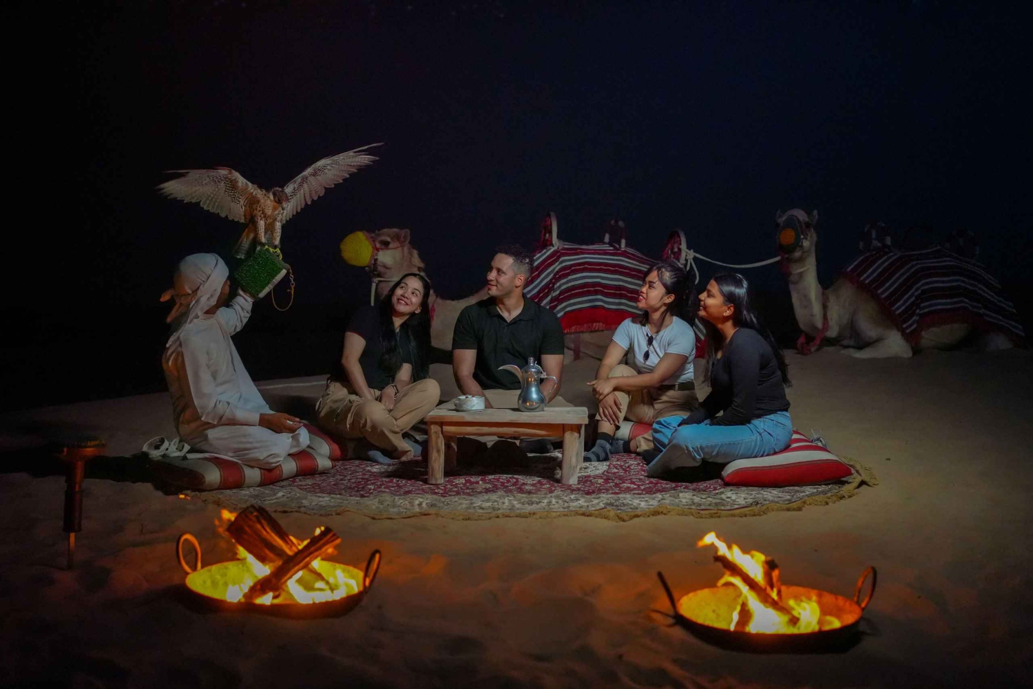 Seuraavaksi tapaat arabihaukkamme ja majesteettiset hevoseni – ja voit ottaa upeita kuvia. Kokeile sitten hiekkalautailua tähtien alla
