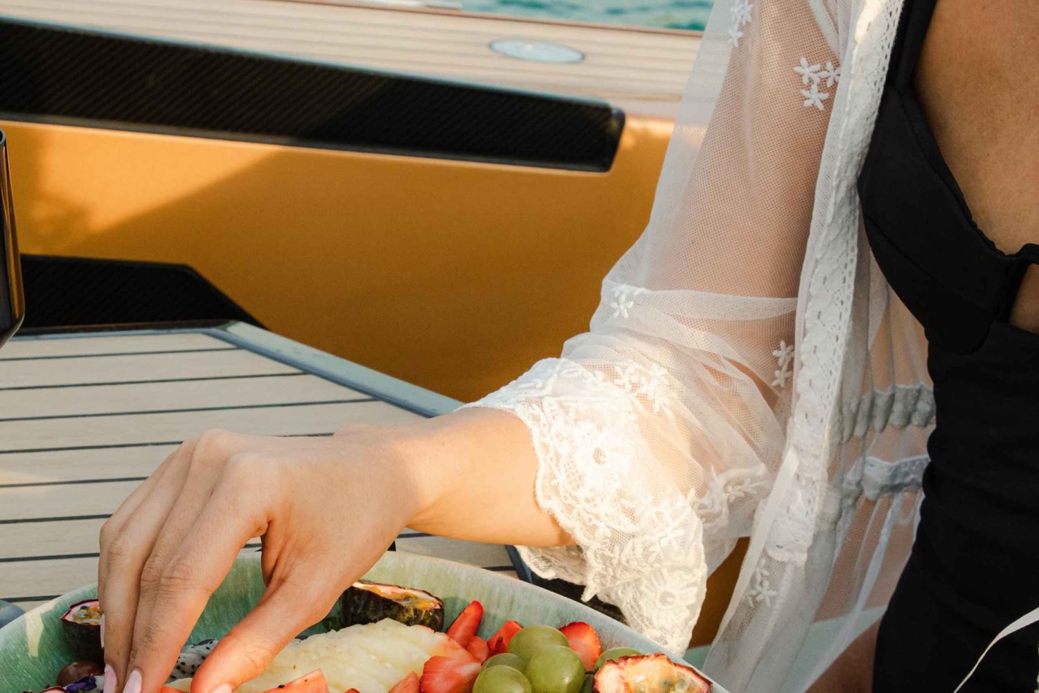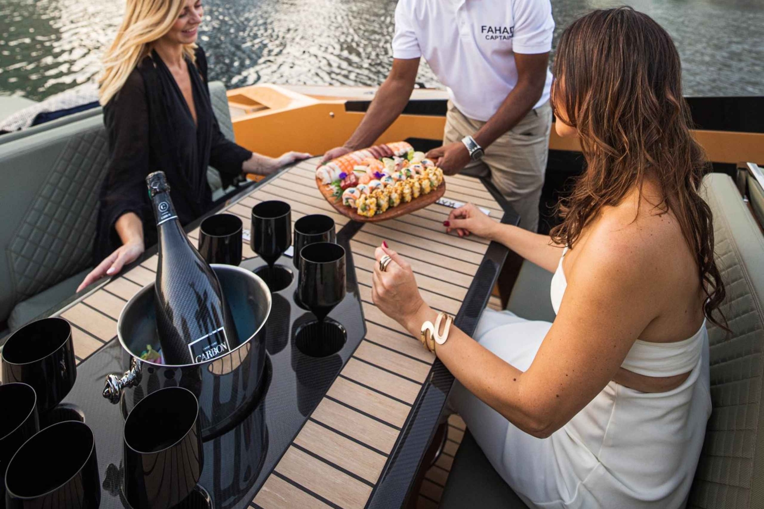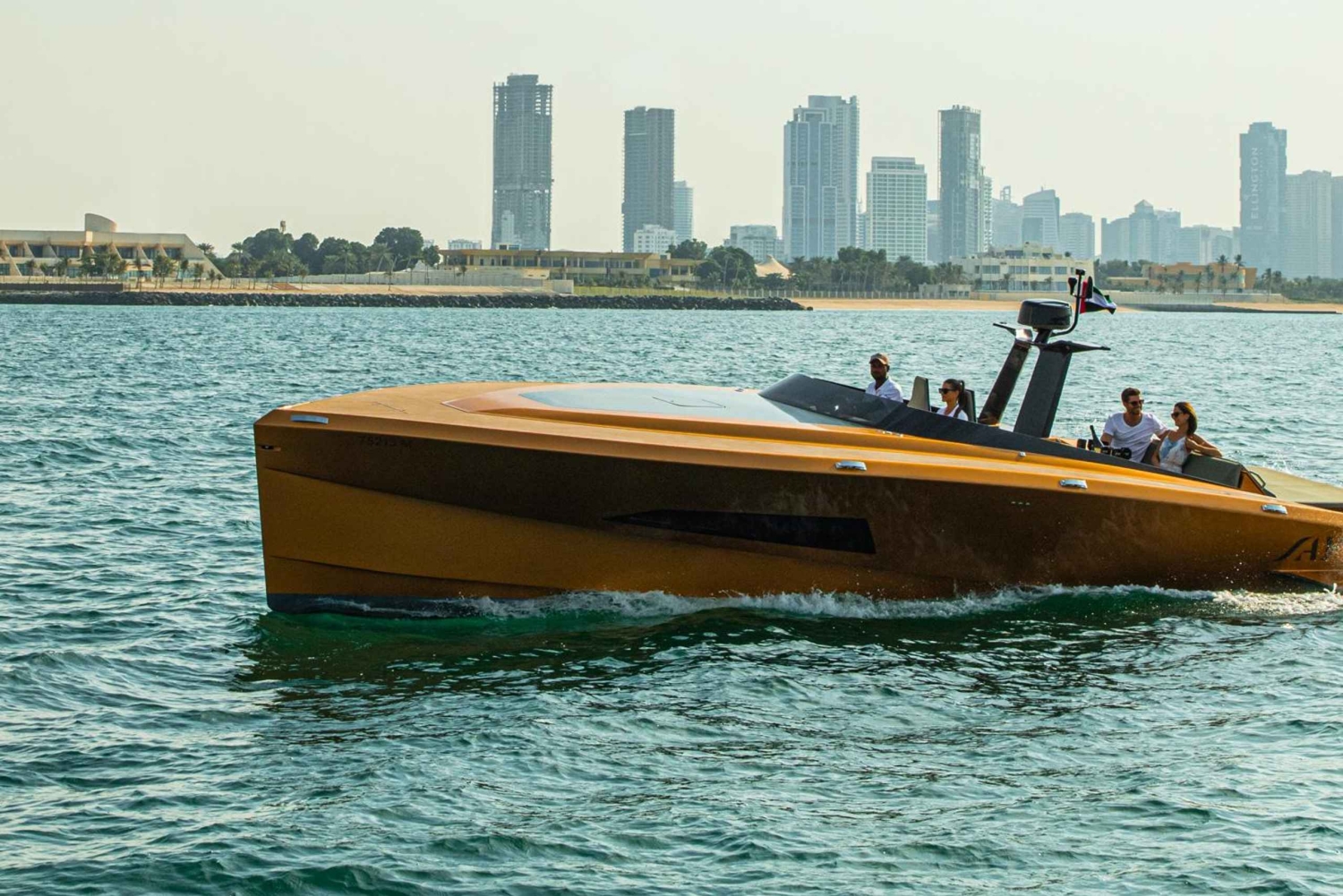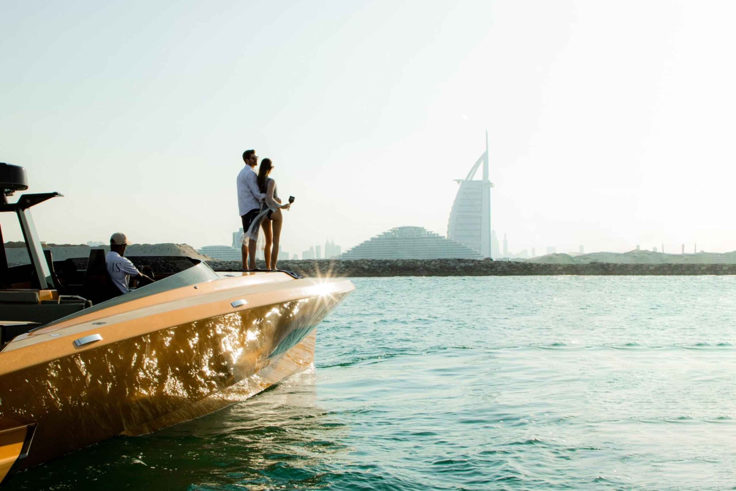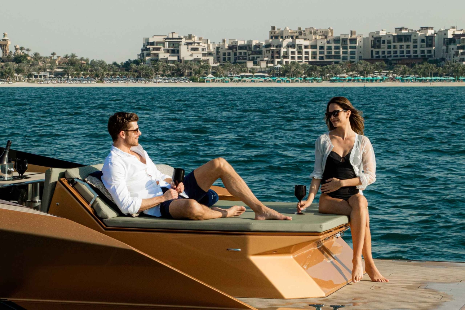 Croisière privée en yacht au départ de la marina de Dubaï, en passant par JBR, Bluewaters et Palm Jumeirah, avec vue sur Ain Dubai, Atlantis et Burj Al Arab : une expérience élégante et relaxante au coucher du soleil.