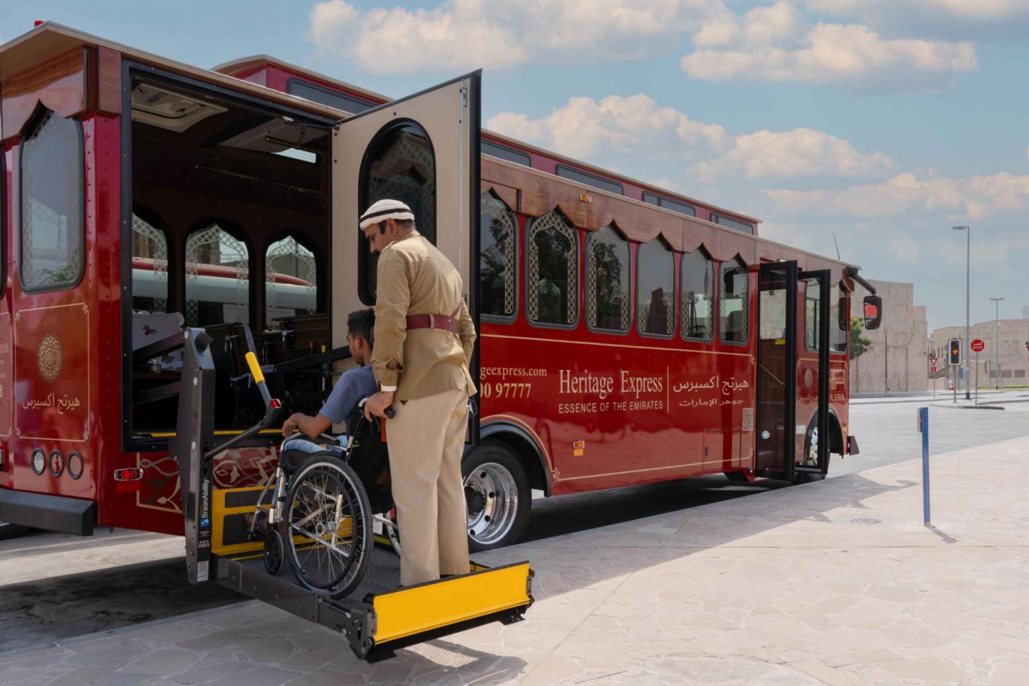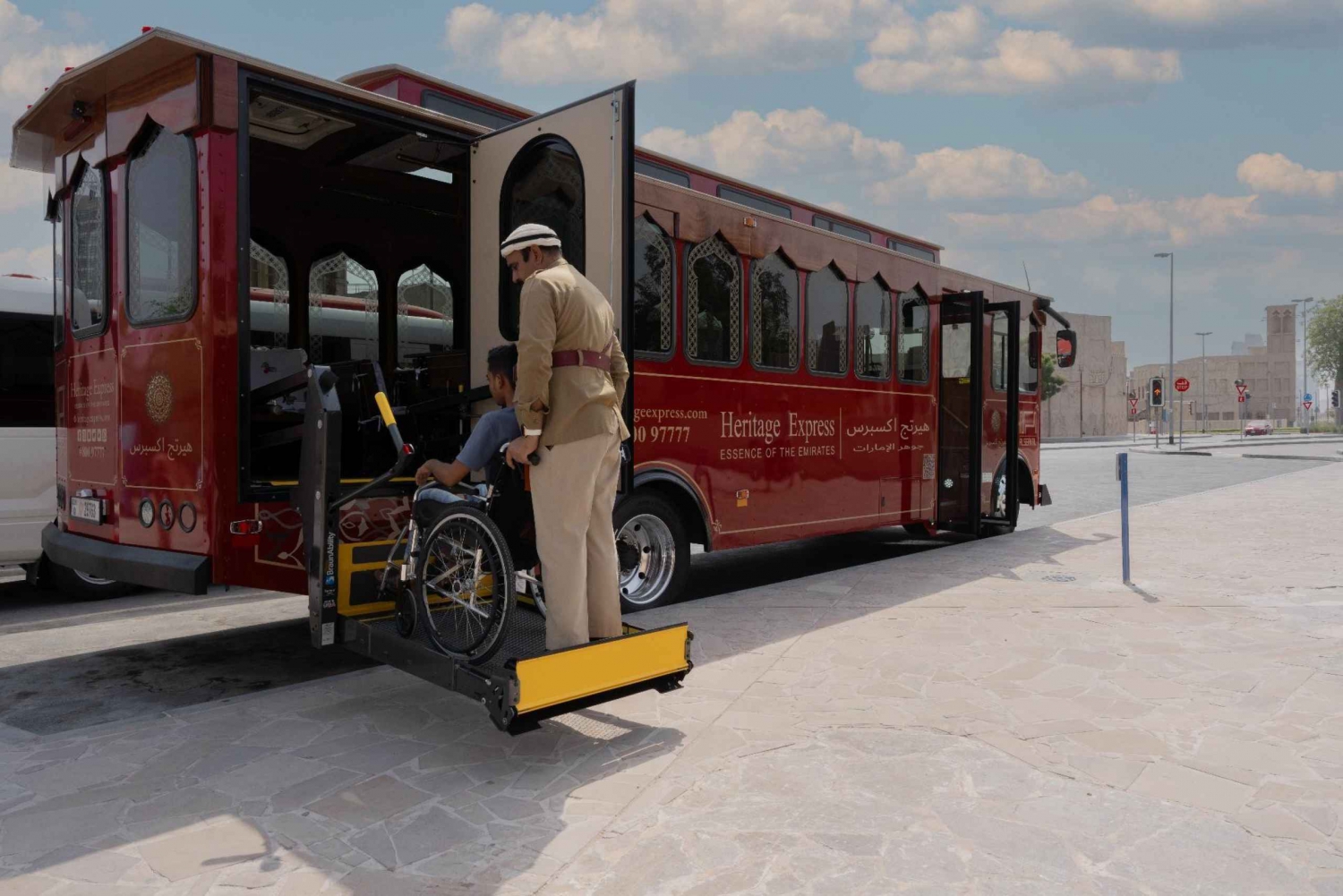 Rencontrez votre guide et montez à bord du trolley Heritage Express pour découvrir les curiosités, les saveurs et l'essence de l'hospitalité émirienne. Apprenez-en plus sur la culture à la Maison du patrimoine du Centre Sheikh Mohammed bin Rashid pour la compréhension culturelle..
