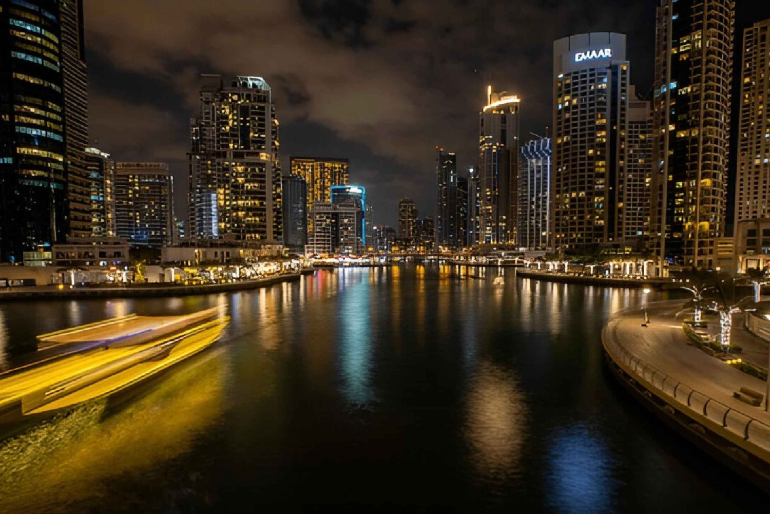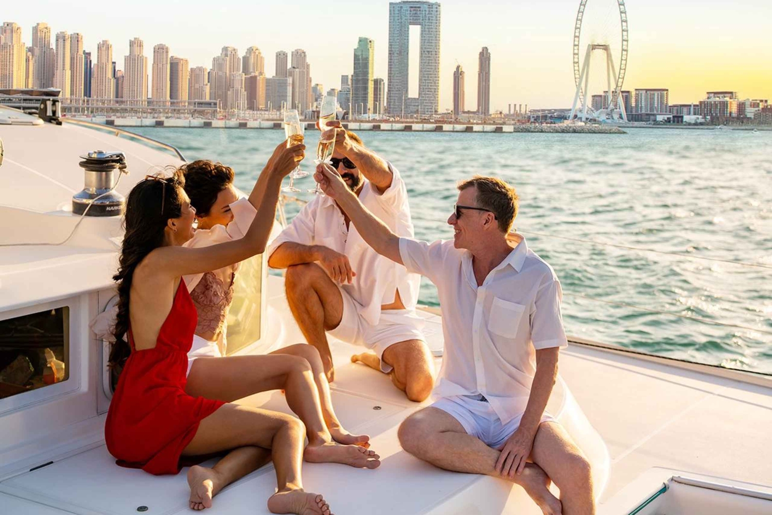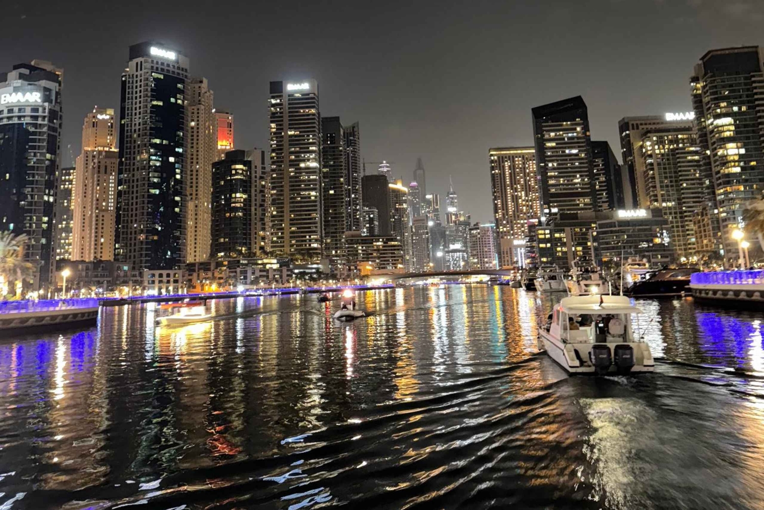 Votre voyage débute au magnifique canal de la marina de Dubaï, où la ligne d'horizon scintillante et l'architecture moderne constituent un cadre idéal. Au départ de votre yacht privé, vous glisserez sur des eaux calmes en direction de certains des lieux d'intérêt les plus célèbres de Dubaï. Naviguez devant l'imposante Ain Dubai, l'île de Bluewaters et la côte pittoresque de JBR, magnifiquement illuminées en soirée. Les reflets des lumières de la ville dansant sur l'eau ajoutent une touche magique à votre croisière privée, créant un cadre à la fois serein et captivant.