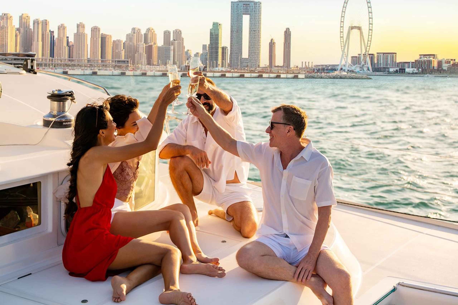 Goditi una serata magica su uno yacht di lusso attraverso l'iconico Dubai Marina Canal, con viste spettacolari su Ain Dubai, Burj Al Arab e lo skyline scintillante della città. Mentre scivoli sulle acque tranquille, immergiti nella vibrante energia dei punti di riferimento illuminati di Dubai, unendo eleganza e relax.