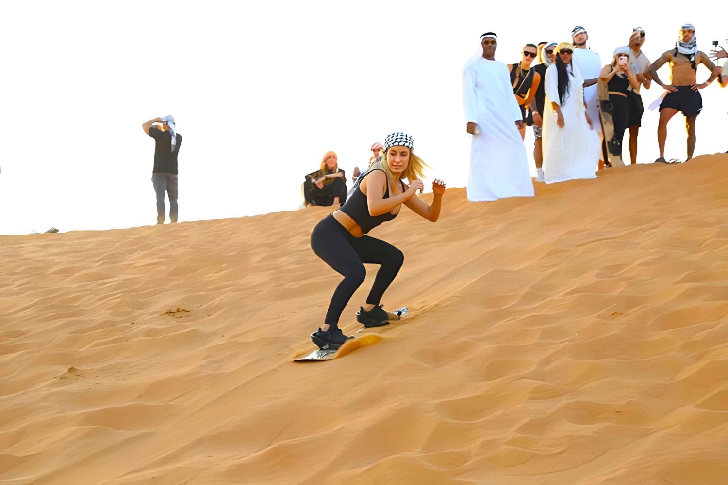 Poi trascorrerai 30-45 minuti di avventurosa corsa sulle dune, sandboarding e foto al tramonto prima di proseguire attraverso le dune per raggiungere il campo nel deserto.