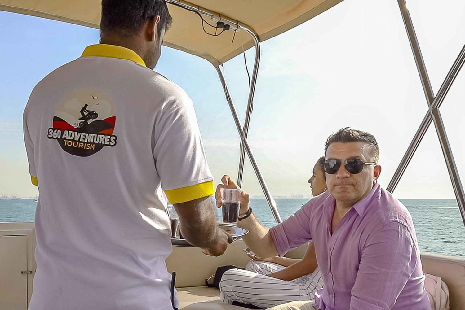 クルーズ中は、ヨットの快適さと優雅さをお楽しみください。ソフトドリンクと水はご自由にお召し上がりいただけます。穏やかな海風を感じながら、水上から眺めるドバイの絶景を存分にお楽しみください。これは、日中に空から眺めた景色に完璧に調和する体験となるでしょう。