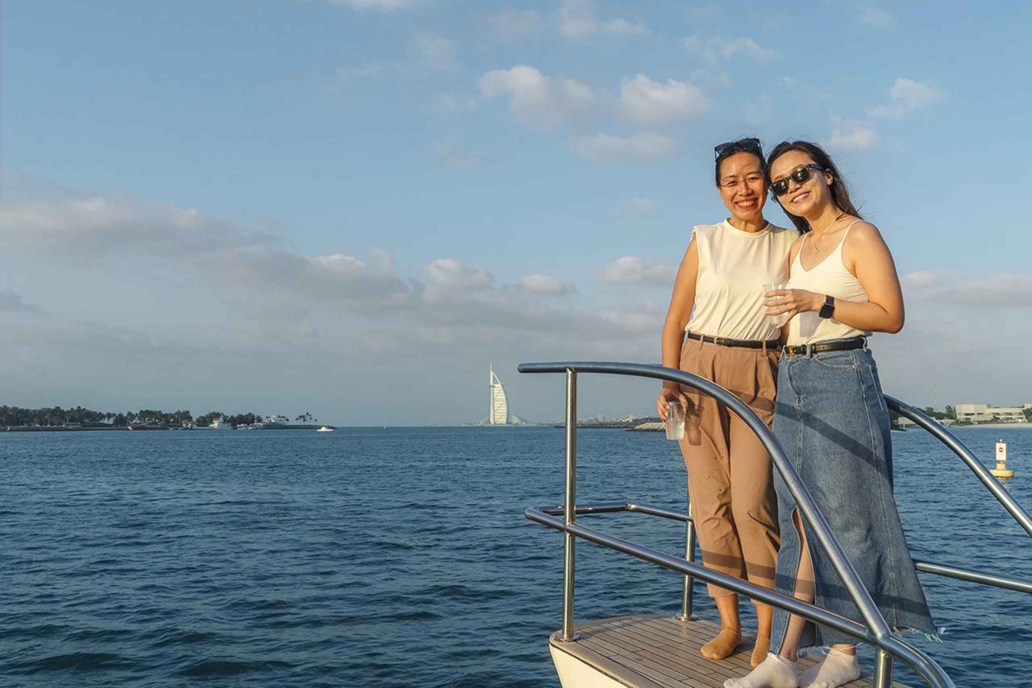 ザ・ビューでのご滞在(約1.5時間)の後、午後のヨットツアー(約1.5時間)へと旅を続けます。ドバイ・ハーバーへ向かい、プレミアムヨットに乗船後、街の象徴的な海岸線を航海いたします。オープンデッキでくつろぎながら、アトランティス・ザ・パームや世界最大の観覧車アイン・ドバイなど、有名なランドマークをクルーズで巡ります。