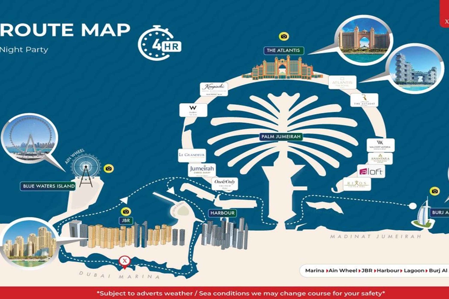 ドバイのマリーナから出発する特別なクルーズをお楽しみください。ご家族やご友人と一緒にドバイマリーナを訪れ、アインホイールやJBRの景色を写真に収めてみませんか。海からの特別な見晴らしの良い場所から、世界最大の観覧車アイン・ドバイをご覧ください。