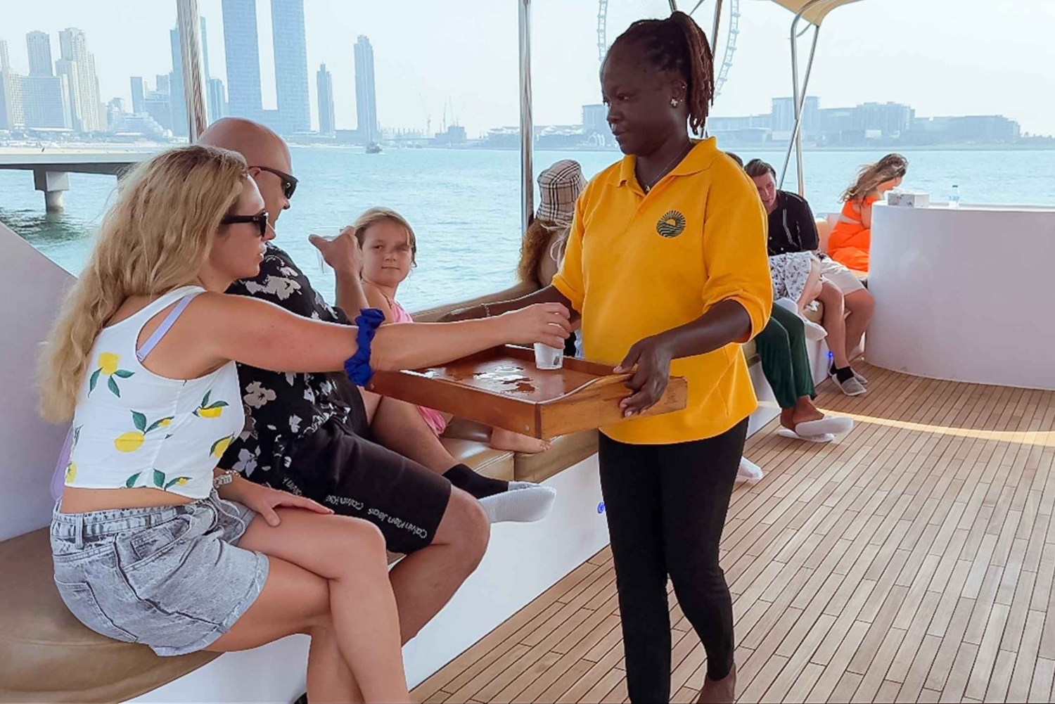 船に乗り込まれた瞬間から、プロフェッショナルでフレンドリーなクルーがお客様を歓迎いたします。無料のソフトドリンクと水でお出迎えいたしますので、旅の間中リフレッシュしていただけます。ご選択の時間帯によっては、フムスやクブズ(パン)などの本格的なアラビア料理とともに、焼きたてのBBQ串焼きをお楽しみいただける軽食ボックスもご用意いたします。