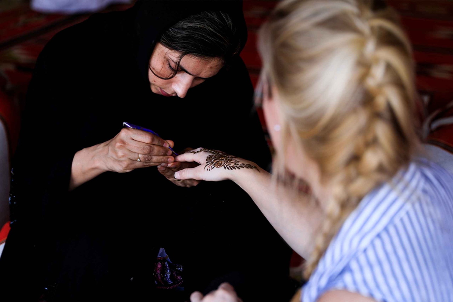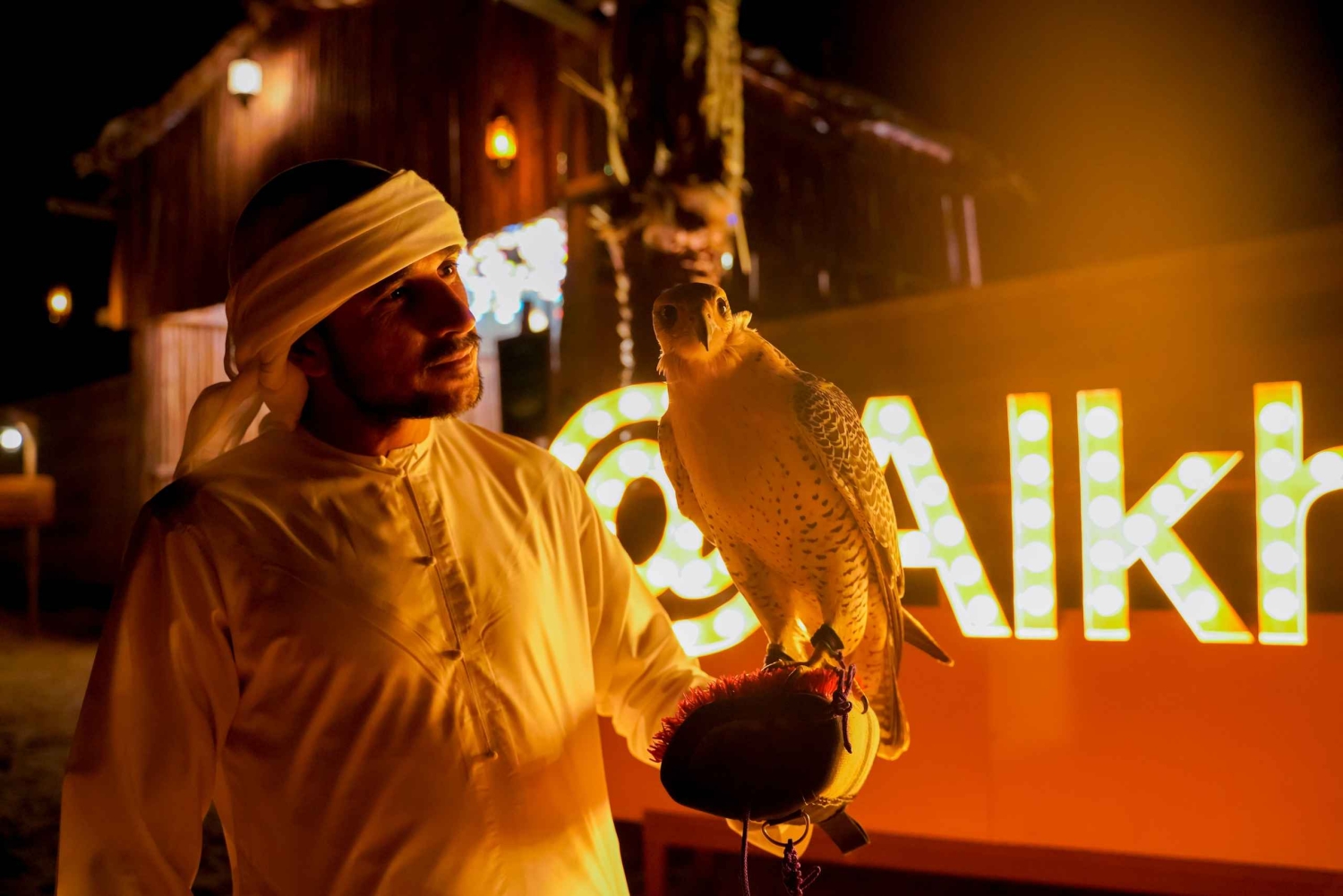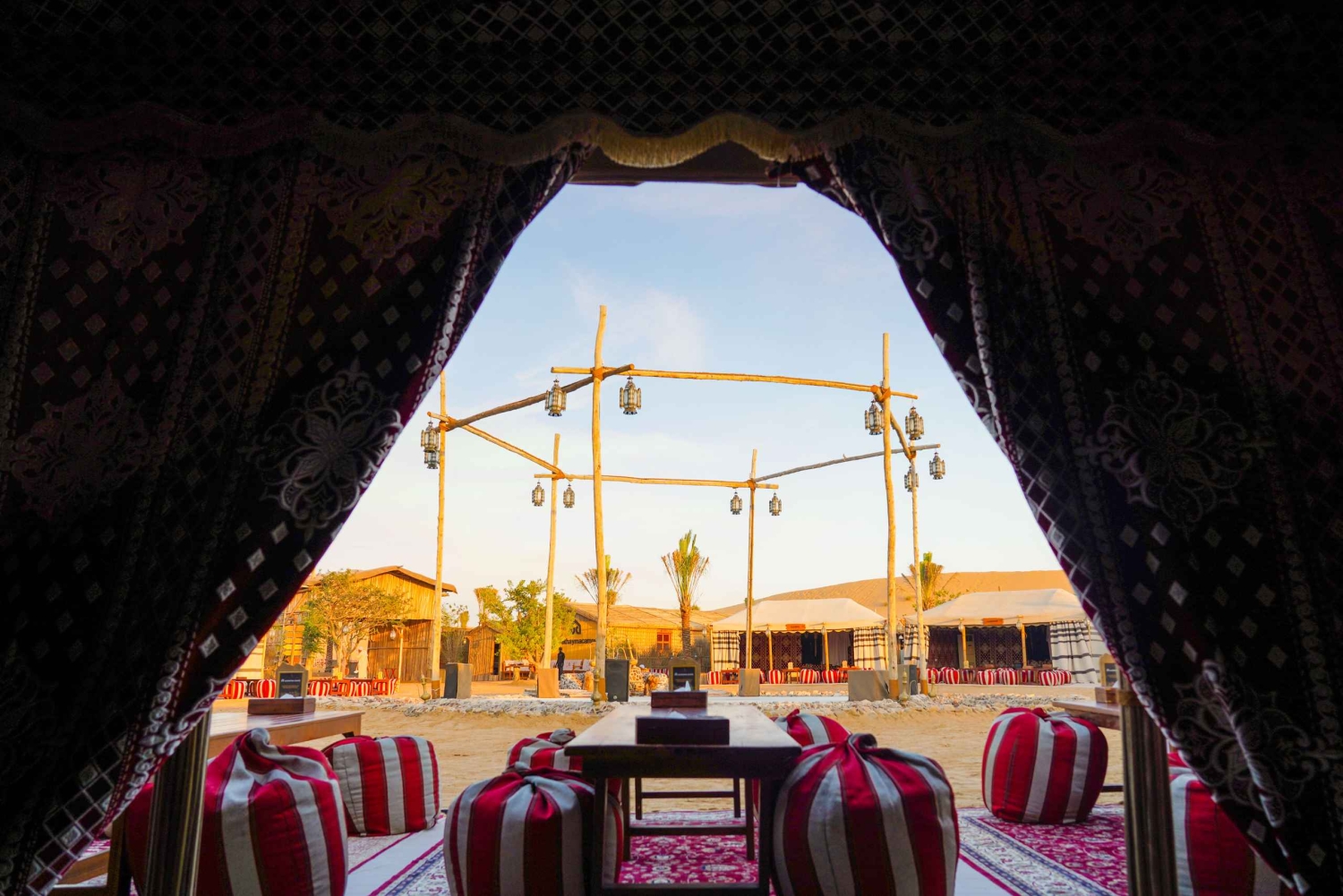 テント内でアラビア コーヒーとルカイマットのアレンジメントを試してから、ブランコに乗ったり、伝統的なアラビアのヘッド スカーフ (グトラ) を巻いて写真を撮ったりしてください。