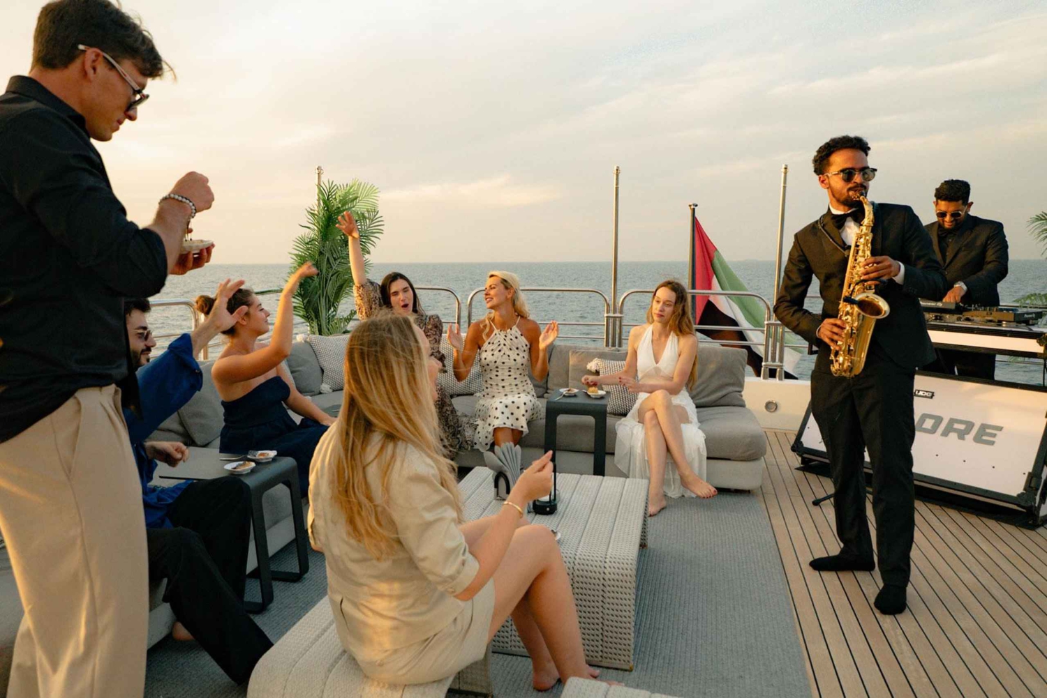 ドバイ:サンシーカー スーパーヨットでVIPディナー、ドリンク、ライブDJをお楽しみください