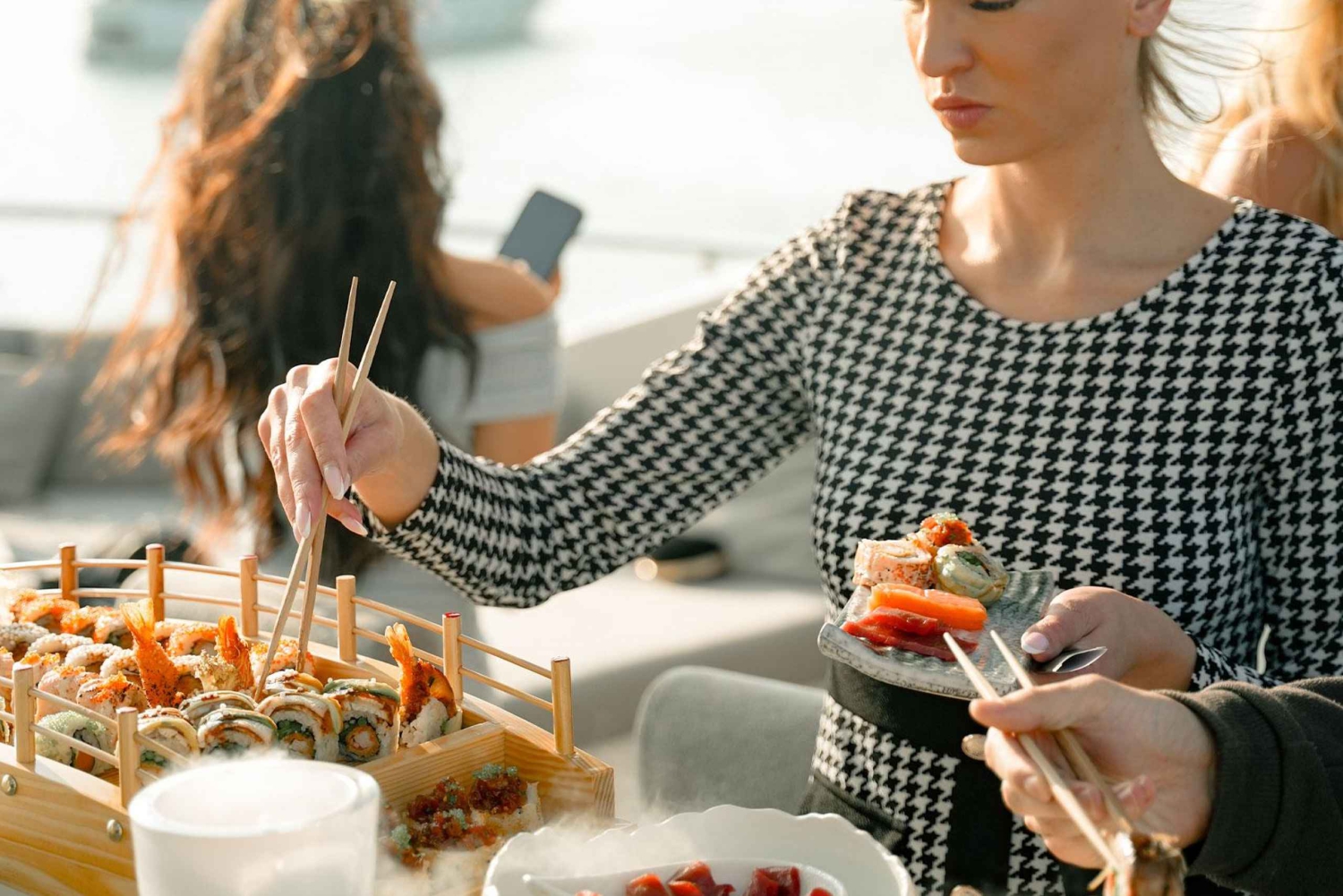 - 豪華なスーパーヨットクルーズで、おまかせ寿司メニューの味をお楽しみください