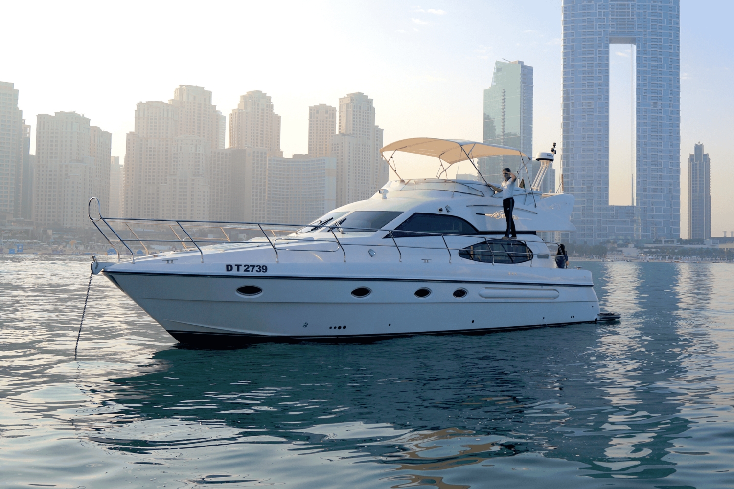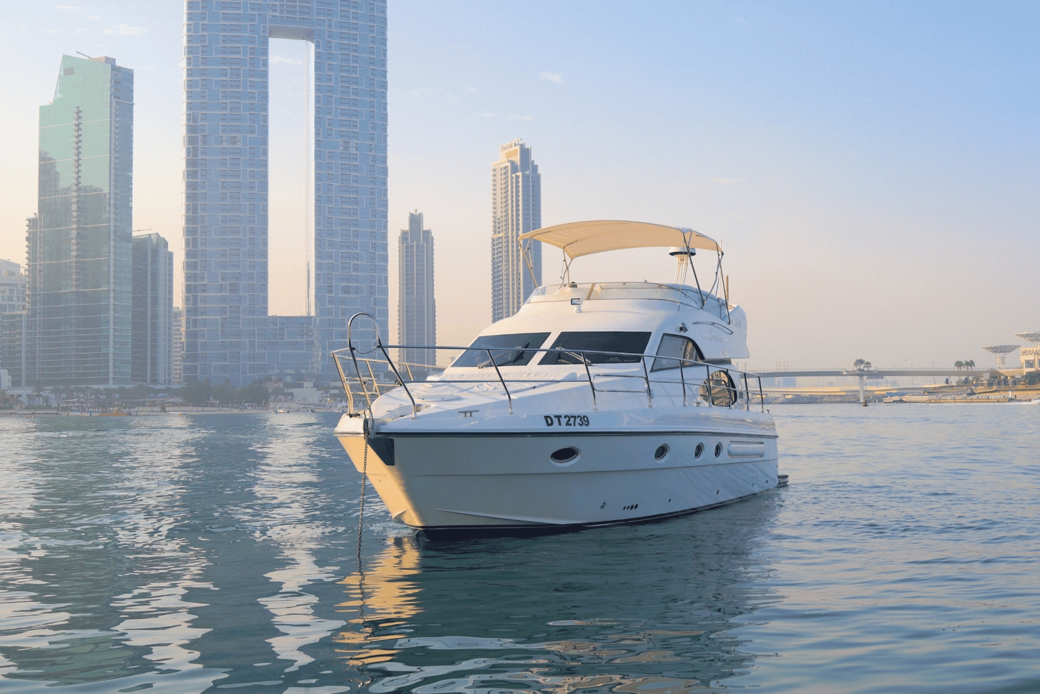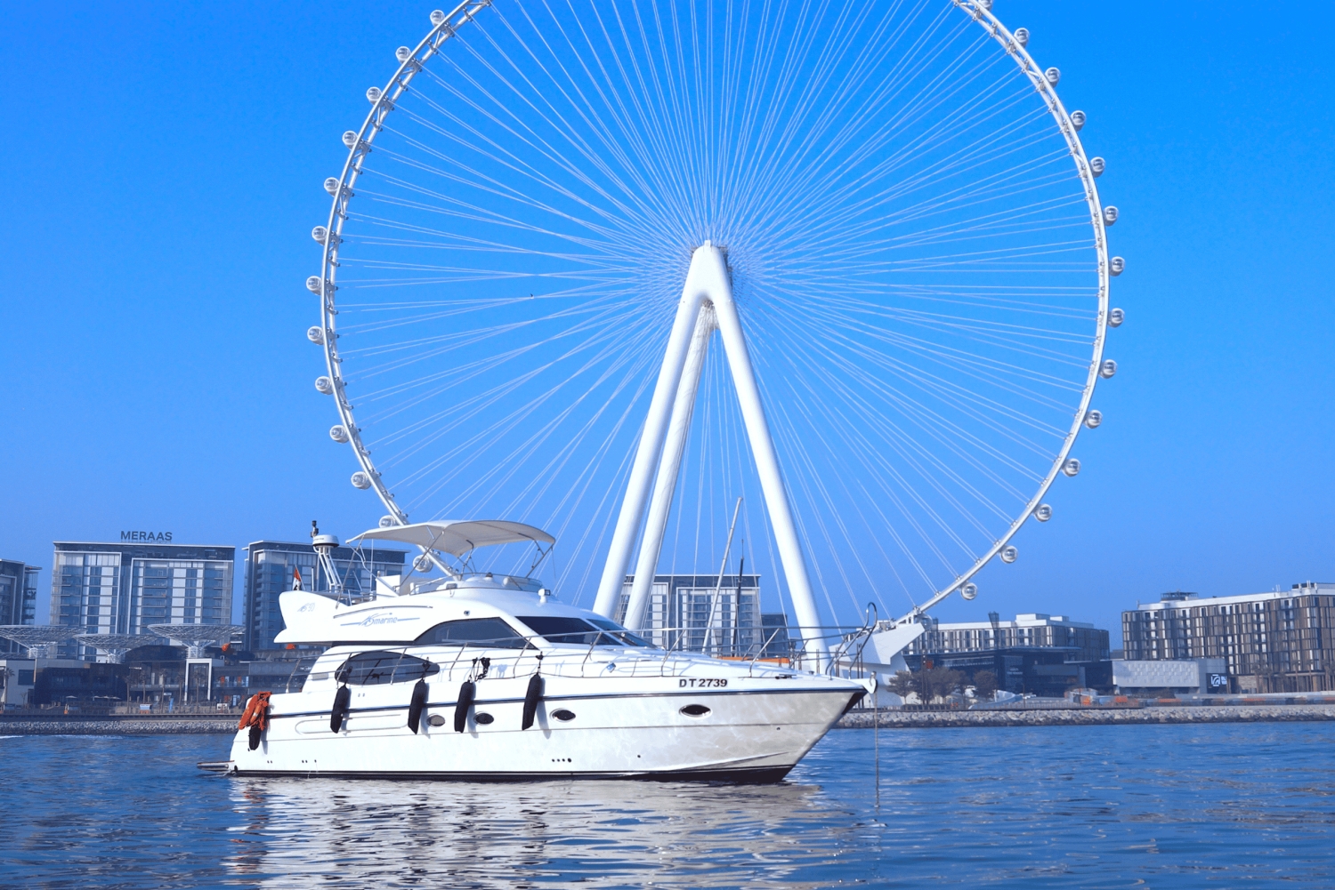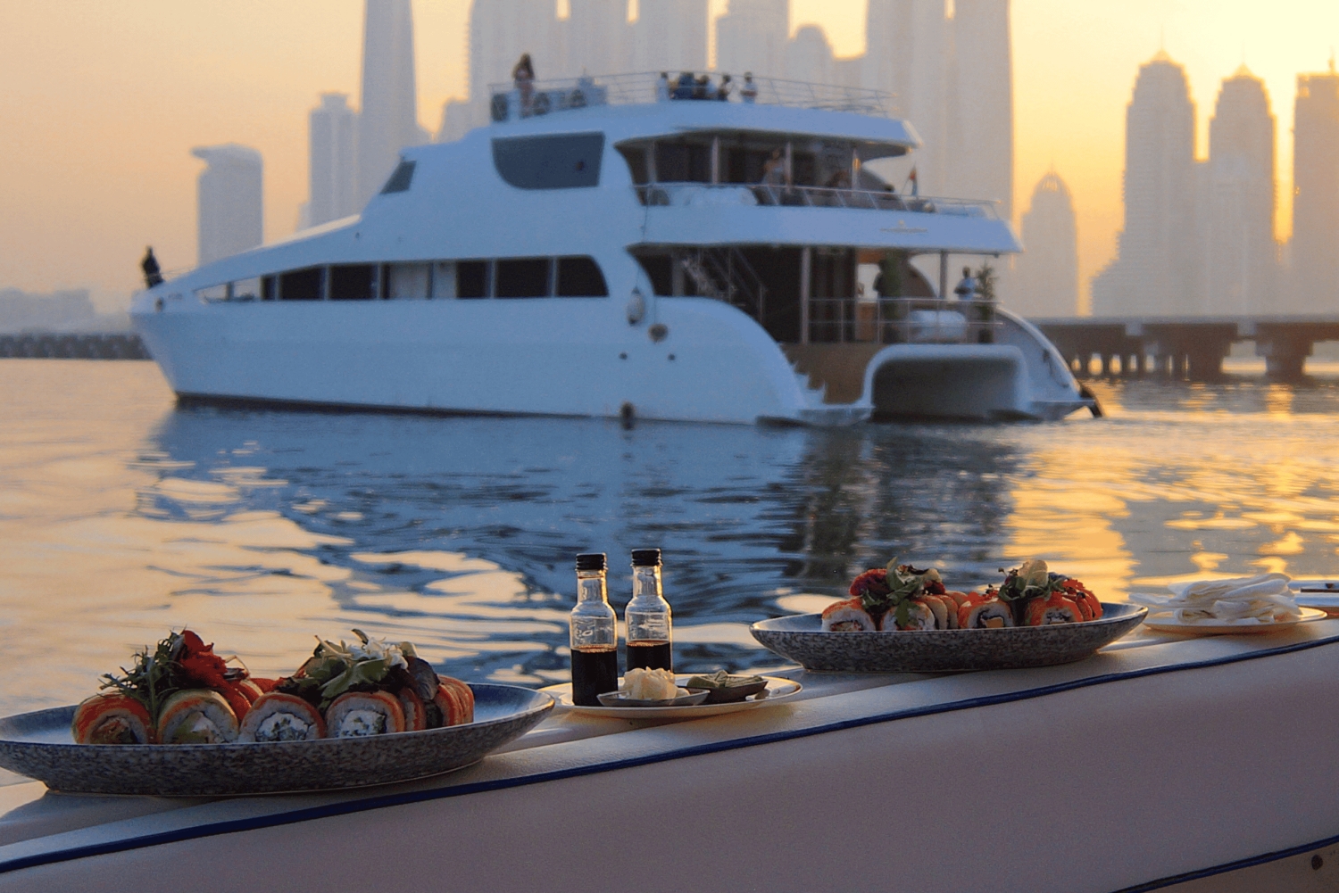 ドバイ・マリーナをプライベートヨットでスタイリッシュに航行し、アイン・ドバイの景色をお楽しみください。長めの旅では、ブルジュ・アル・アラブやアトランティスを訪れることができます。寿司プラッターは追加オプションとしてご利用いただけますので、クルーズをさらに充実させることができます。