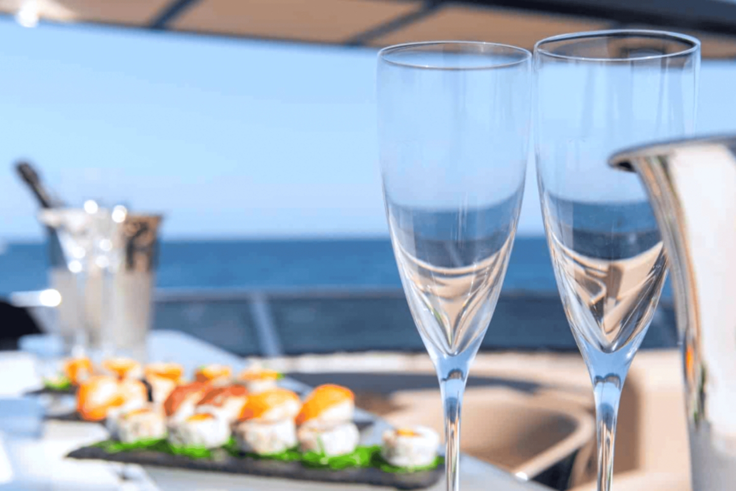広々とした屋外デッキでおくつろぎいただき、Bluetoothで流れる優しい音楽をお楽しみいただき、ワインやシャンパン(船上でご用意しております)で乾杯していただけます。
