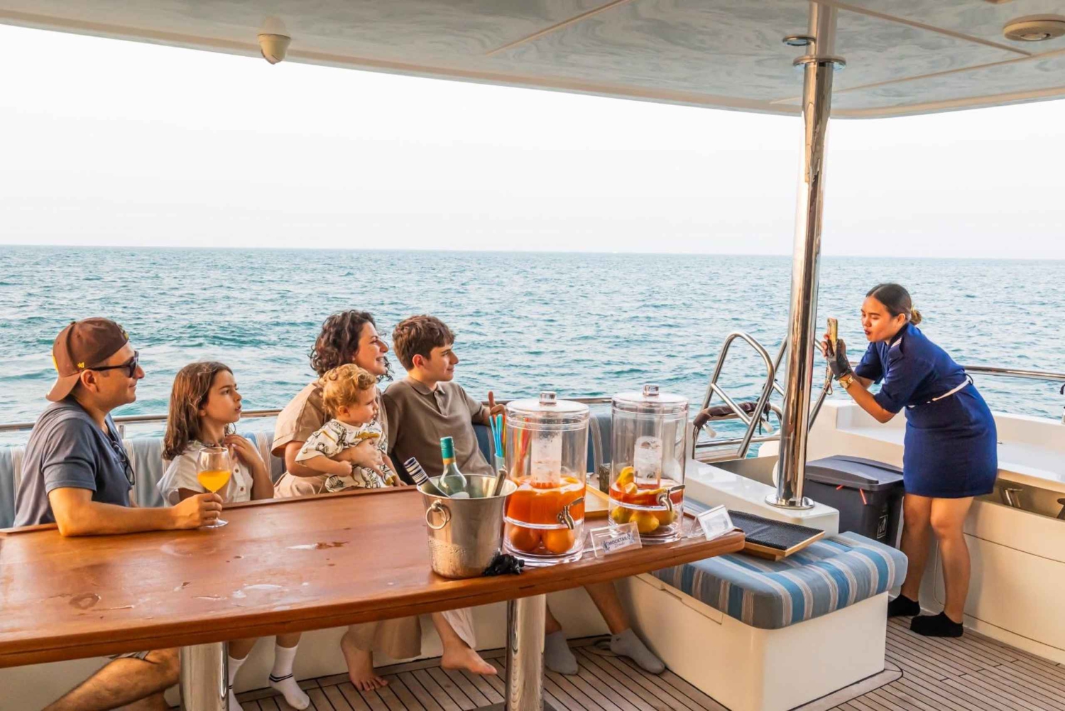 この美しいメガヨットにご乗船になり、ドバイの中心部で忘れられない2時間30分のサンセット体験をお楽しみください。アラビアの地平線に沈む黄金の太陽を眺めながら、オープンバーのカクテルやドリンク、ジュージューのBBQ串焼き(ベジタリアンあり)、爽やかなフルーツプラッターをお楽しみください。すべて船上で調理されます。
