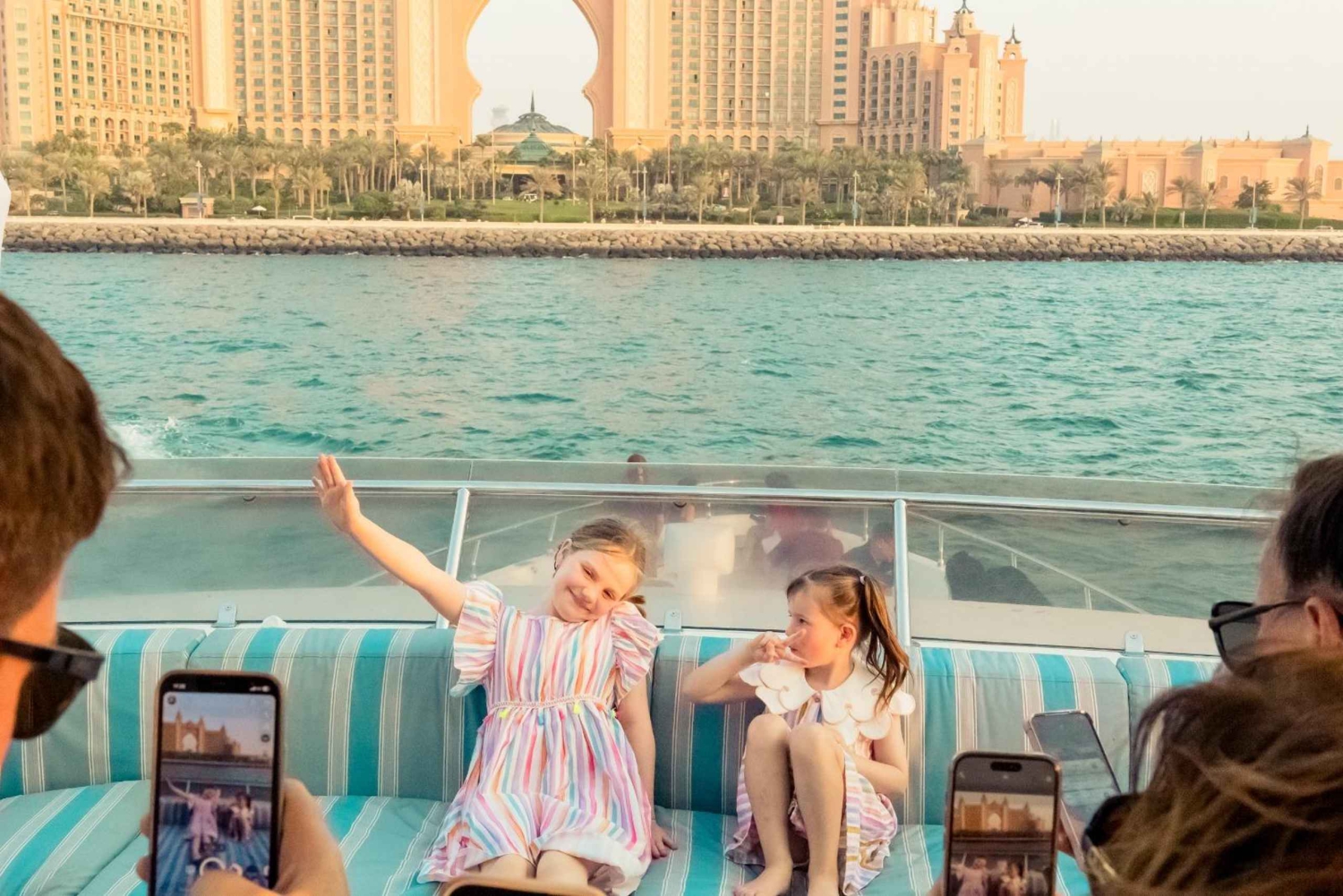 ドバイハーバーの中心部から毎日夕暮れ時に出発するこのクルーズは、単なる旅行以上のものです。一生の思い出を作りながら、スタイリッシュにリラックスしたいご家族向けにデザインされた体験です。