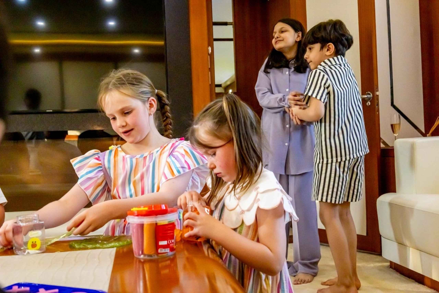 ドバイの壮大な高層ビル群の輝きを眺めながらリラックスしていただく間、お子様はアート&クラフト、ダンスゲーム、楽しいレース、ジュース&ソフトドリンクステーションで楽しくお過ごしいただけます。大人のための贅沢とレジャー、そして子供たちのためのノンストップの楽しみが完璧に融合しています。