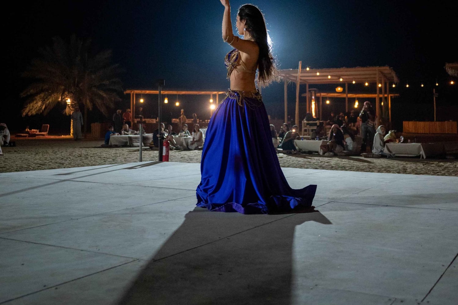 Als de schemering valt, laat je betoveren door live optredens, waaronder de betoverende Tanoura-dans, sierlijke buikdansen en een vurige show die de nachtelijke hemel van de woestijn verlicht. Verken het uitgestrekte zand tijdens een rustige kamelenrit en geniet van de serene woestijnsfeer. Kies uit opties voor dunebashing met 4x4, duinbuggy's en quadfietsen, afhankelijk van de geselecteerde opties.