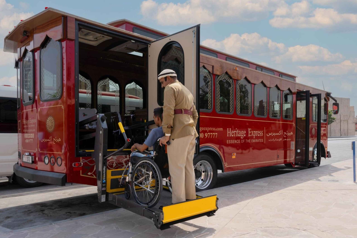 Ontmoet je gids en stap aan boord van de Heritage Express-trolley om de bezienswaardigheden, smaken en essentie van de gastvrijheid van de Emiraten te ontdekken. Leer meer over de cultuur in het Sheikh Mohammed bin Rashid Centre for Cultural Understanding Heritage House.
