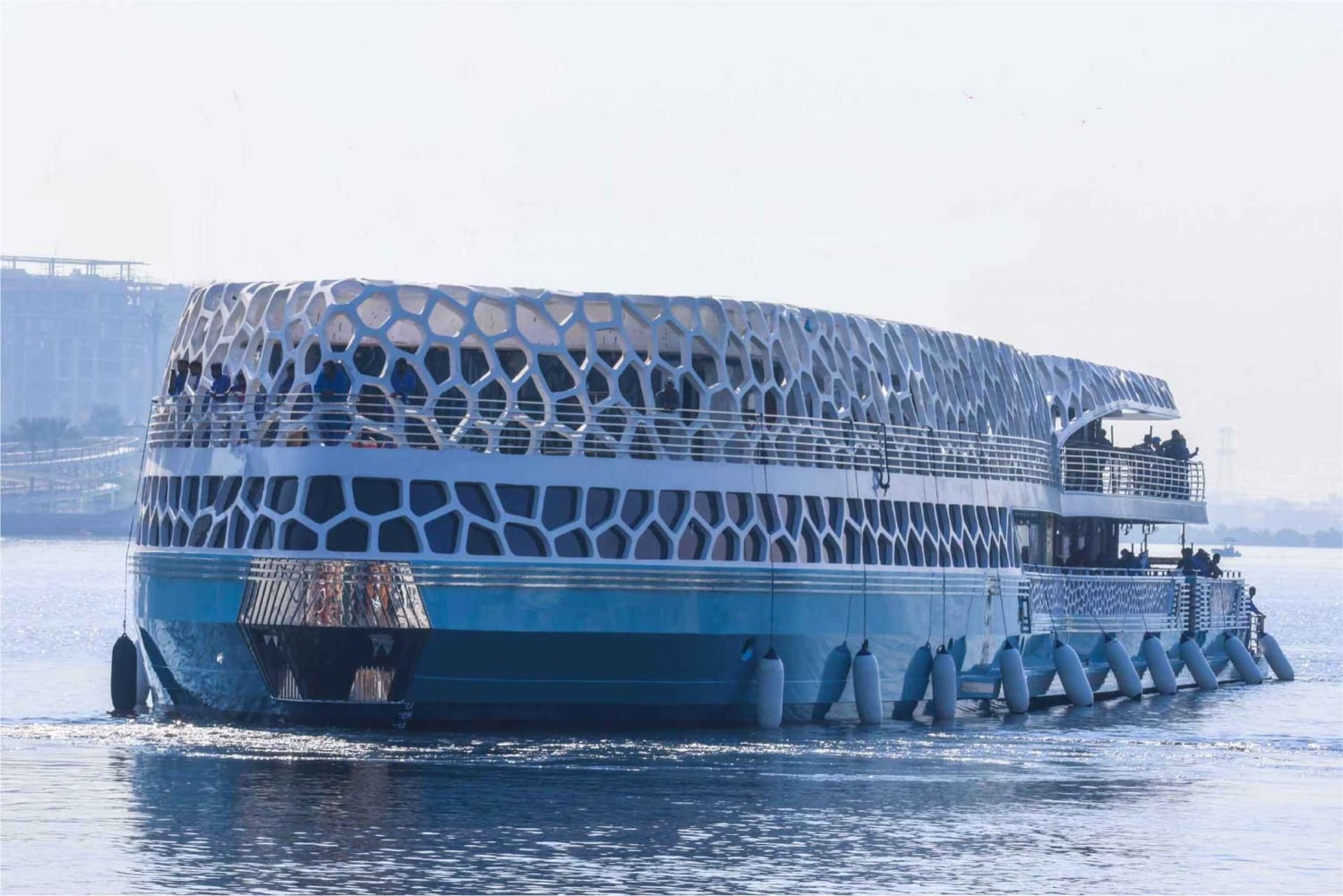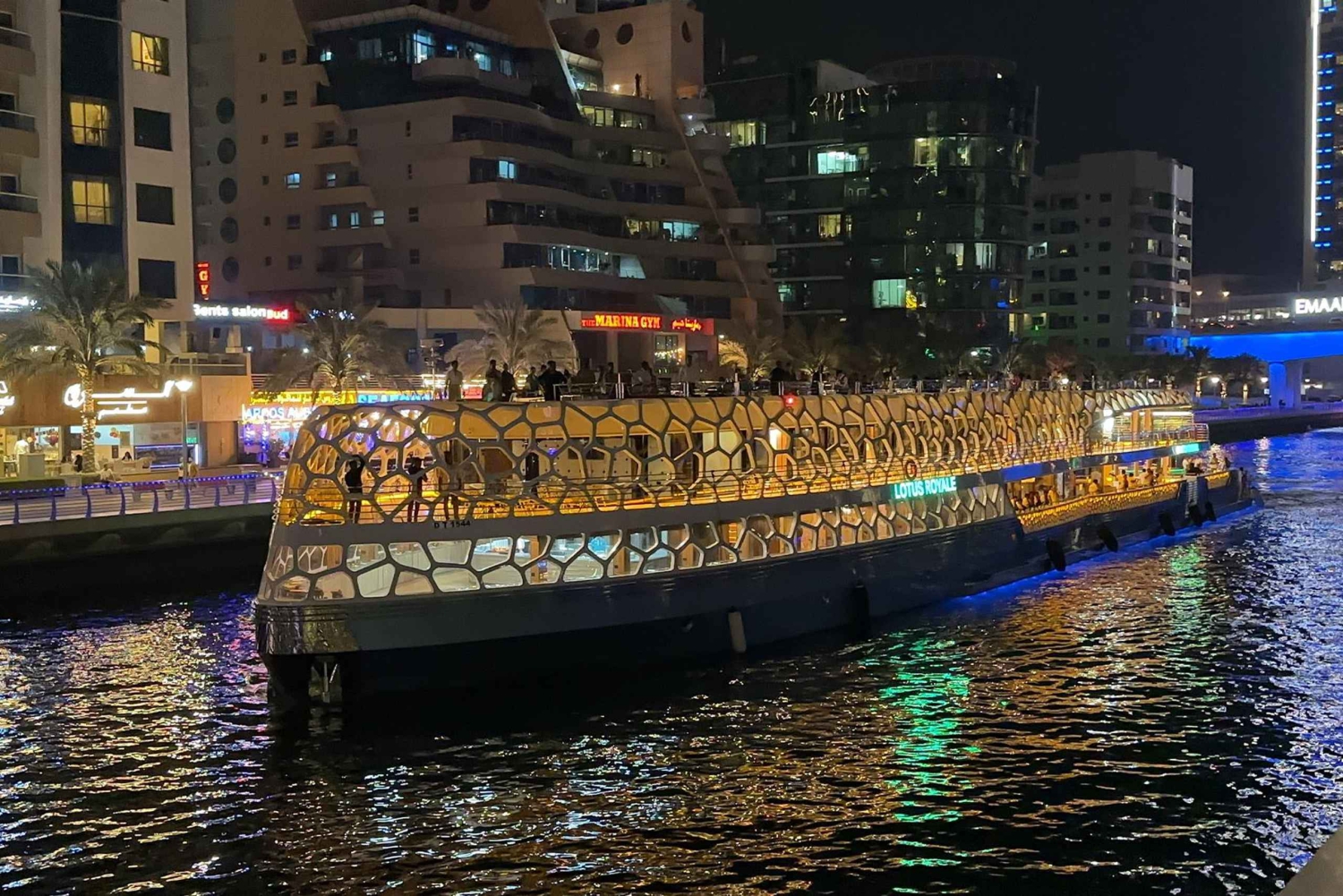 Luidt het nieuwe jaar in luxe in met Lotus tijdens deze mega-jachtcruise in Dubai. Geniet van heerlijke gerechten met het buffet met live kookstation. Proef een scala aan premium alcoholische dranken, prosecco en frisdranken. Bewonder het uitzicht op de skyline van de stad en geniet van het vuurwerk vanaf een bevoorrechte plek. Stap aan boord van een comfortabele Lotus-megajacht voor een unieke nieuwjaarservaring. Upgrade je cruise met de VIP-optie, waarmee je gebruik kunt maken van valet service, VIP-lounge check-in, voorrang bij het instappen en flessenservice aan je gereserveerde tafel op het bovendek, of kies uit vrije zitplaatsen op het bovendek of het hoofddek. Neem je smaakpapillen mee op avontuur met een heerlijk buffet, geniet van onbeperkt drankjes en cruise langs de spectaculaire skyline van Dubai. Maak foto's en geniet van het uitzicht op de Dubai Marina, Palm Jumeirah, Atlantis Hotel en het majestueuze Burj Al Arab Hotel. Laat je betoveren door Ain Dubai, het grootste reuzenrad ter wereld. Tot slot kun je ademloos genieten van het ongelooflijke vuurwerk voordat je veilig terugkeert naar je trefpunt.