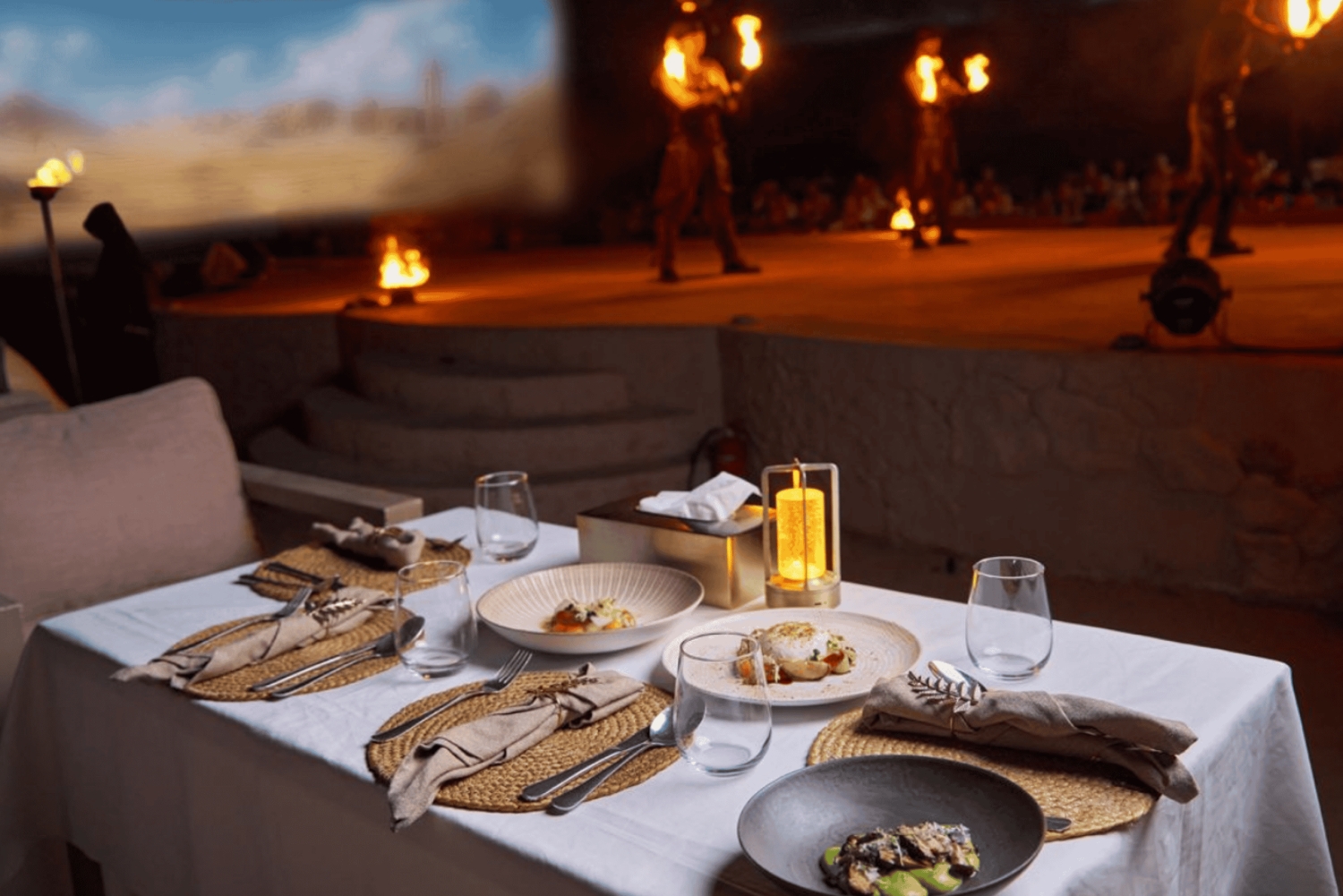 Baby-kamelen voeren en kamelenrit voor volwassenen bij Noble Camp Speeltuin voor kinderen voor plezier en entertainment Internationaal BBQ-dinerbuffet met veganistische en niet-veganistische opties Spectaculaire live vuurshow Live optredens, waaronder traditionele Saïdi-dans, Arabische Noble Night deel 1, traditionele Dabka-dans, Arabische Noble Night deel 2. Trio buikdansshow Zangeres.