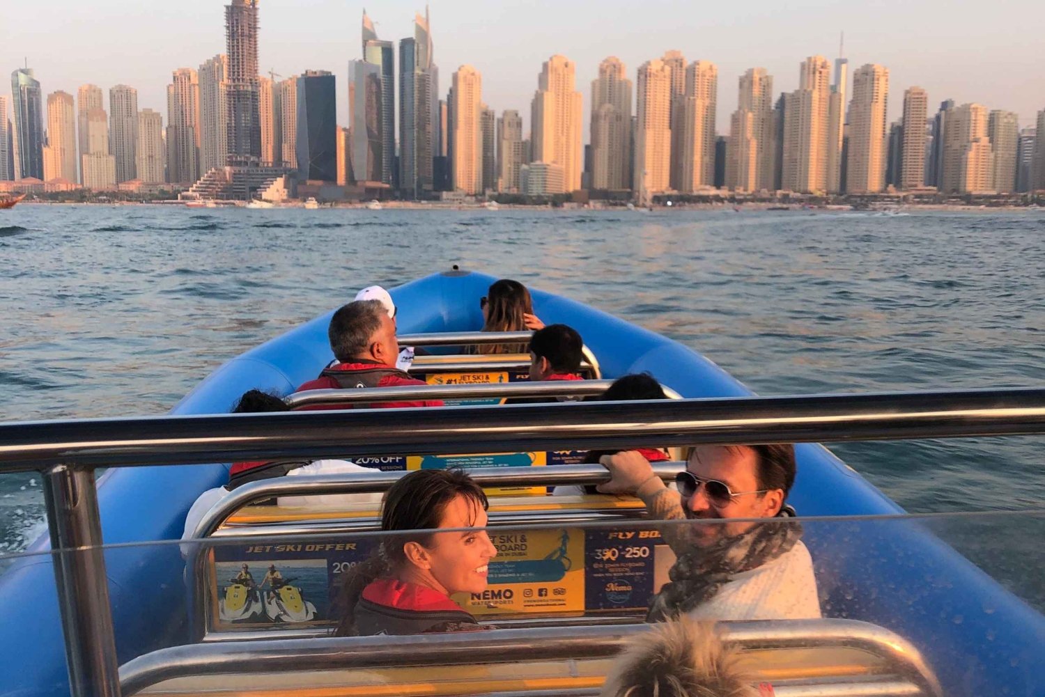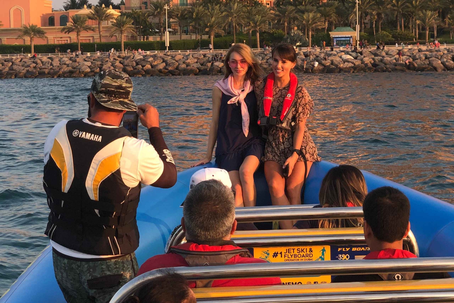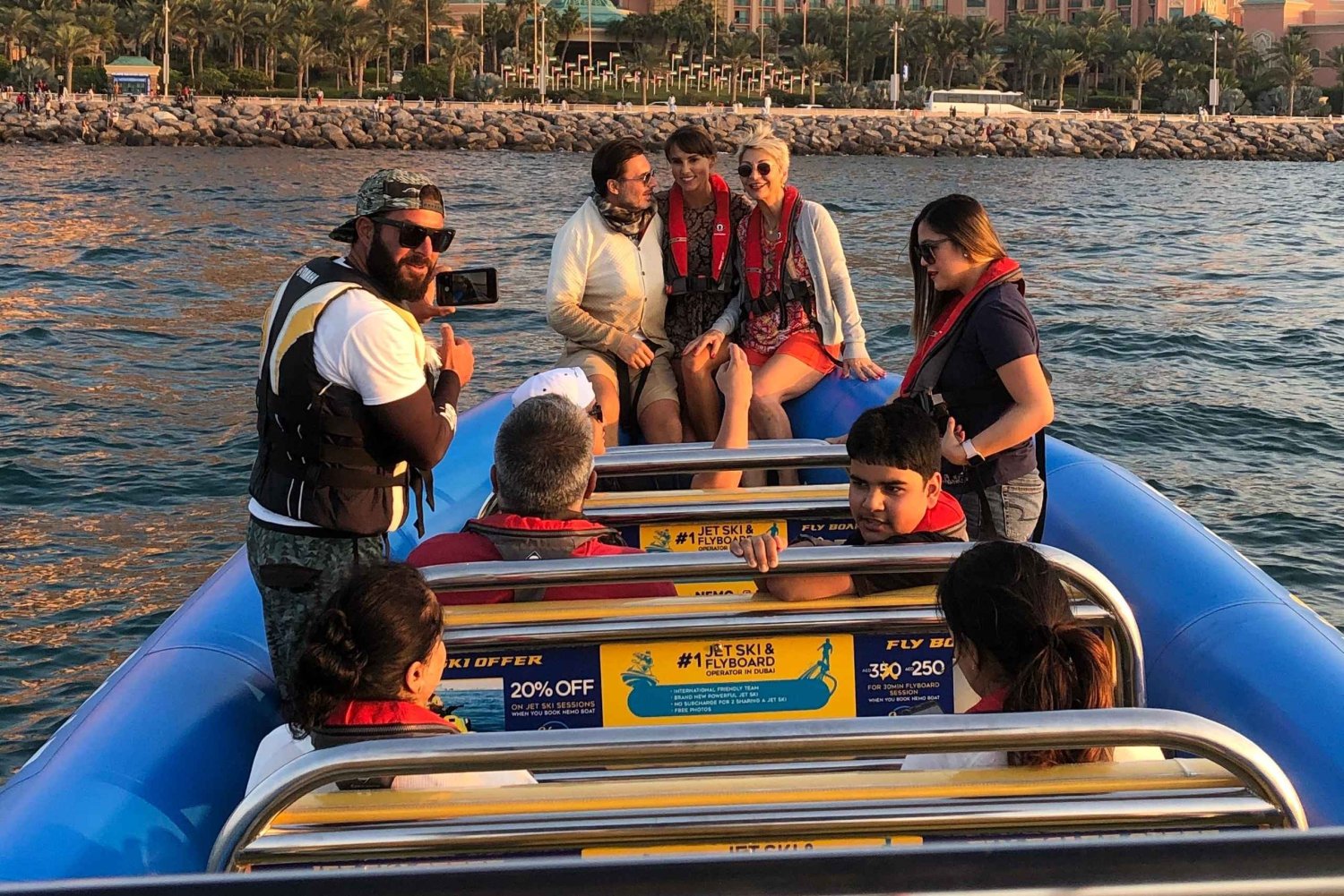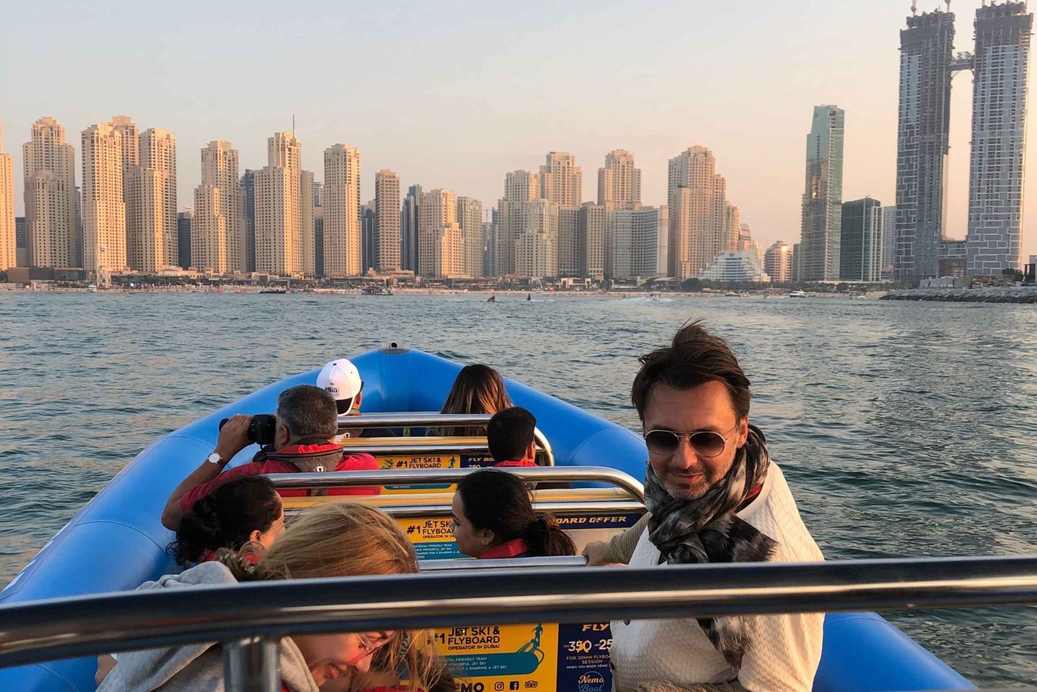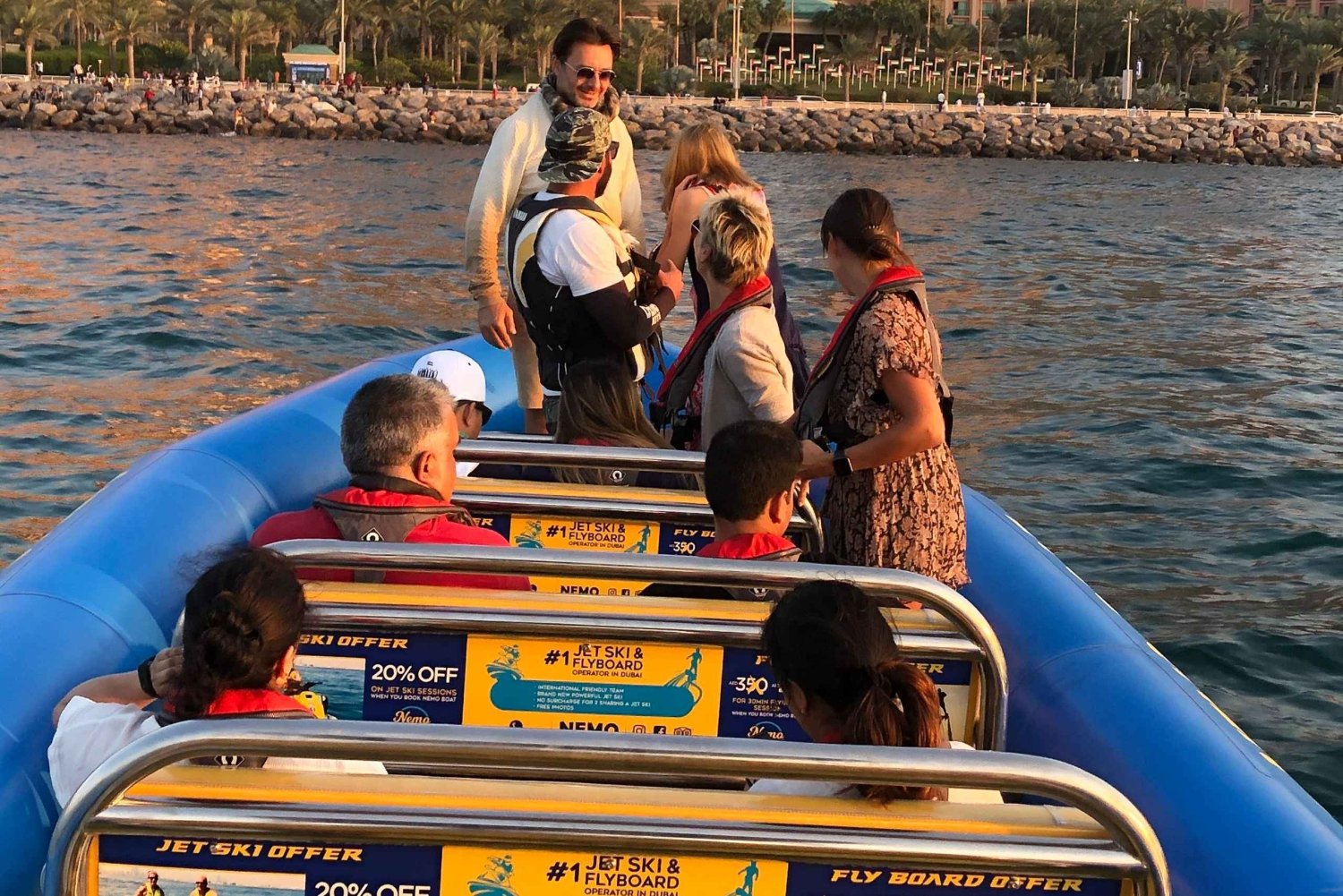 Du møter oss i marinaen vår som ligger i nærheten av Jumeirah Beach Hotel, ved siden av Burj Al Arab. Du blir tatt imot av teamet vårt, og kapteinen og guiden går om bord i Nemo-båten vår, en hurtiggående ribbåt.
