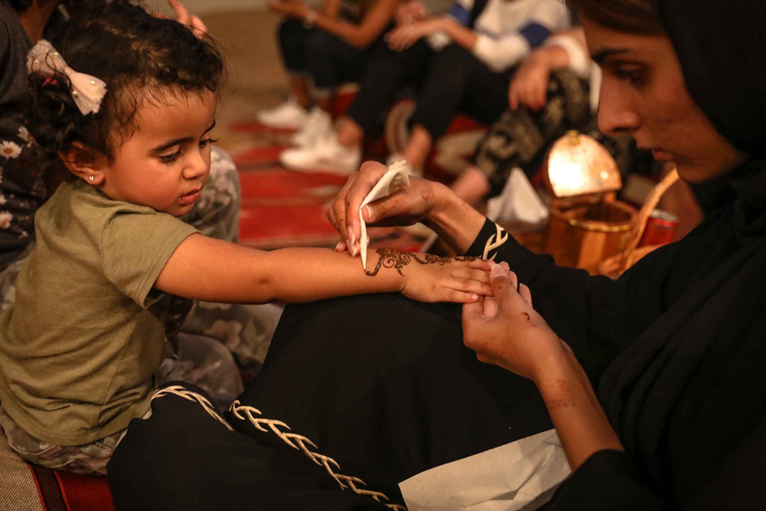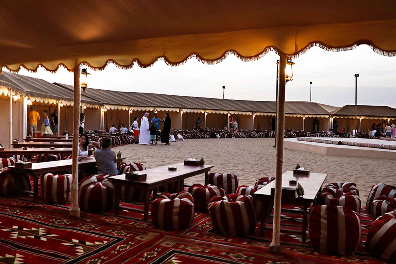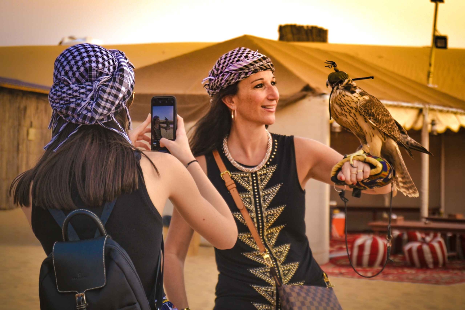 Etter sandboarding fortsetter opplevelsen med flere morsomme aktiviteter i den nærliggende Al Khayma Desert Camp. Her kan du nyte en kameltur over sandlandskapene, få en tradisjonell henna-tatovering eller se et utrolig falkeshow.