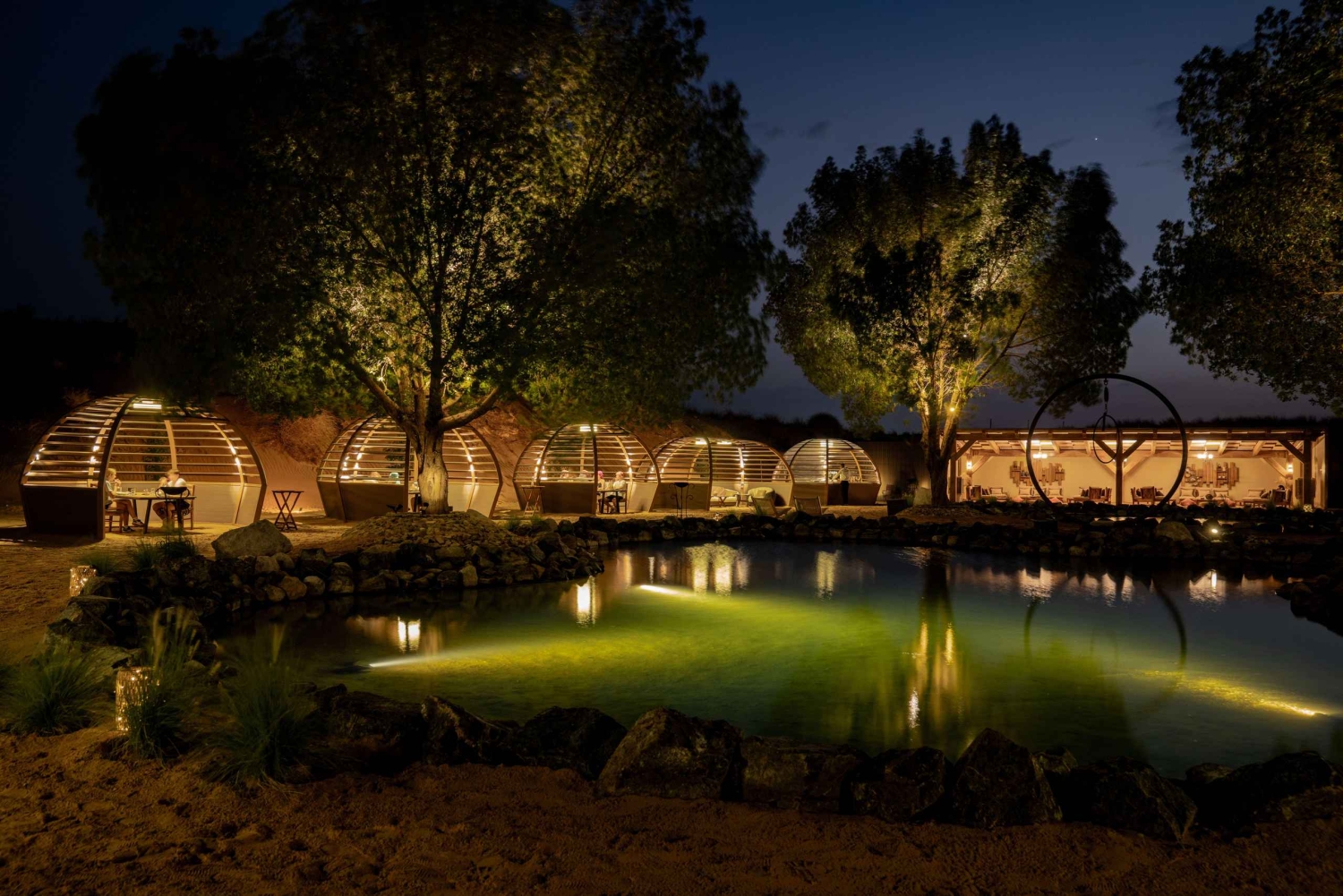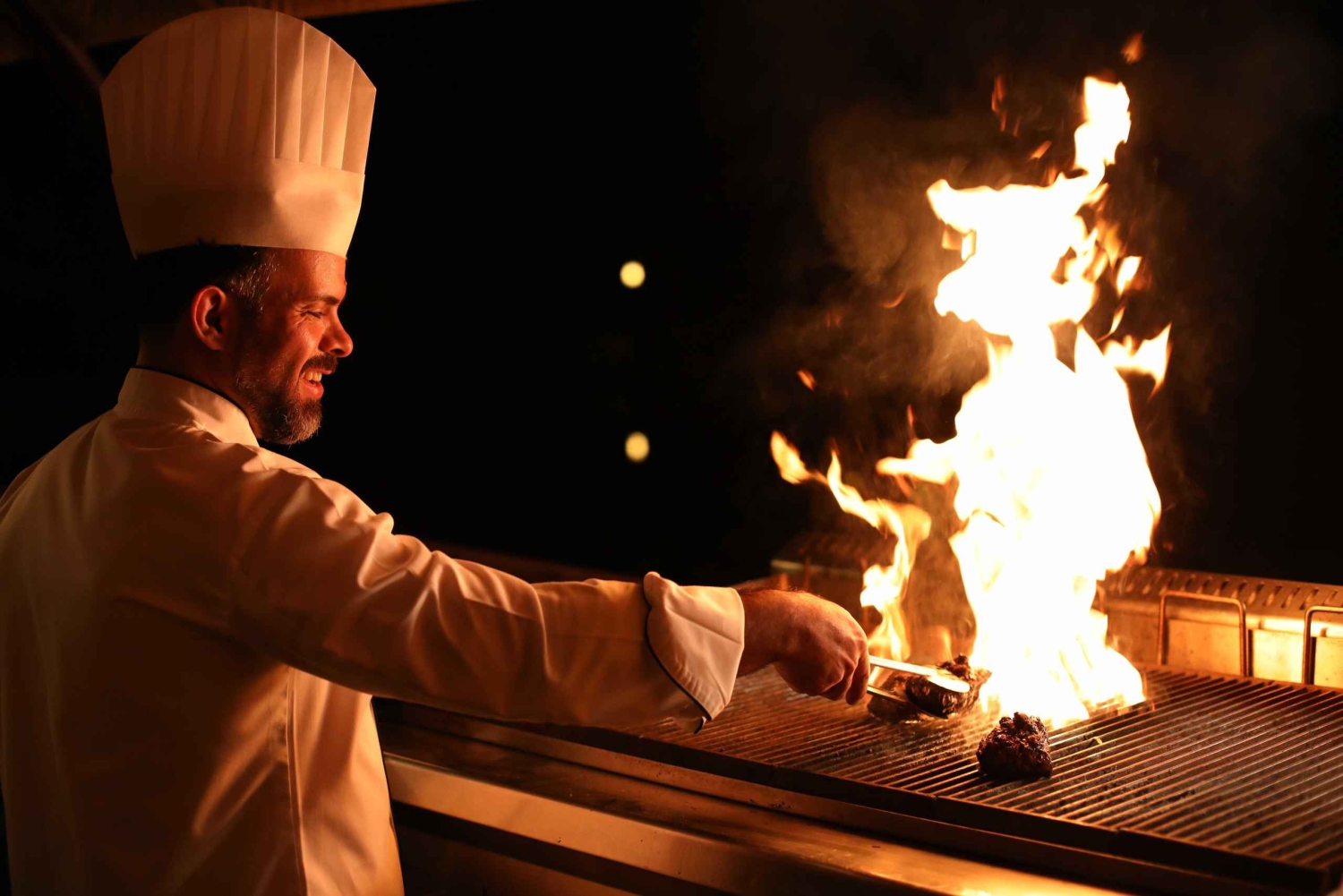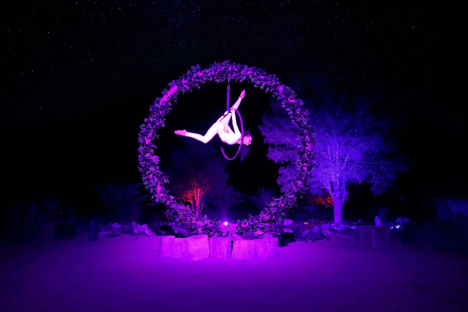 Gdy słońce będzie zachodziło nad wydmami, zobaczysz spektakularny pokaz sokolniczy, delektując się kanapkami i musującym się sokiem. Na kolację zrelaksuj się w spokojnej pustynnej oazie i rozkoszuj się czterodaniową podróżą kulinarną przygotowaną przez szefa kuchni z gwiazdką Michelin. Twoja prywatna kabina jest otoczona przez falujące wydmy i spokojną, cichą pustynię. Wieczór kończy się urzekającym programem rozrywkowym z ogniem i akrobatyką, który sprawi, że nie będziesz mógł oderwać wzroku od ekranu.