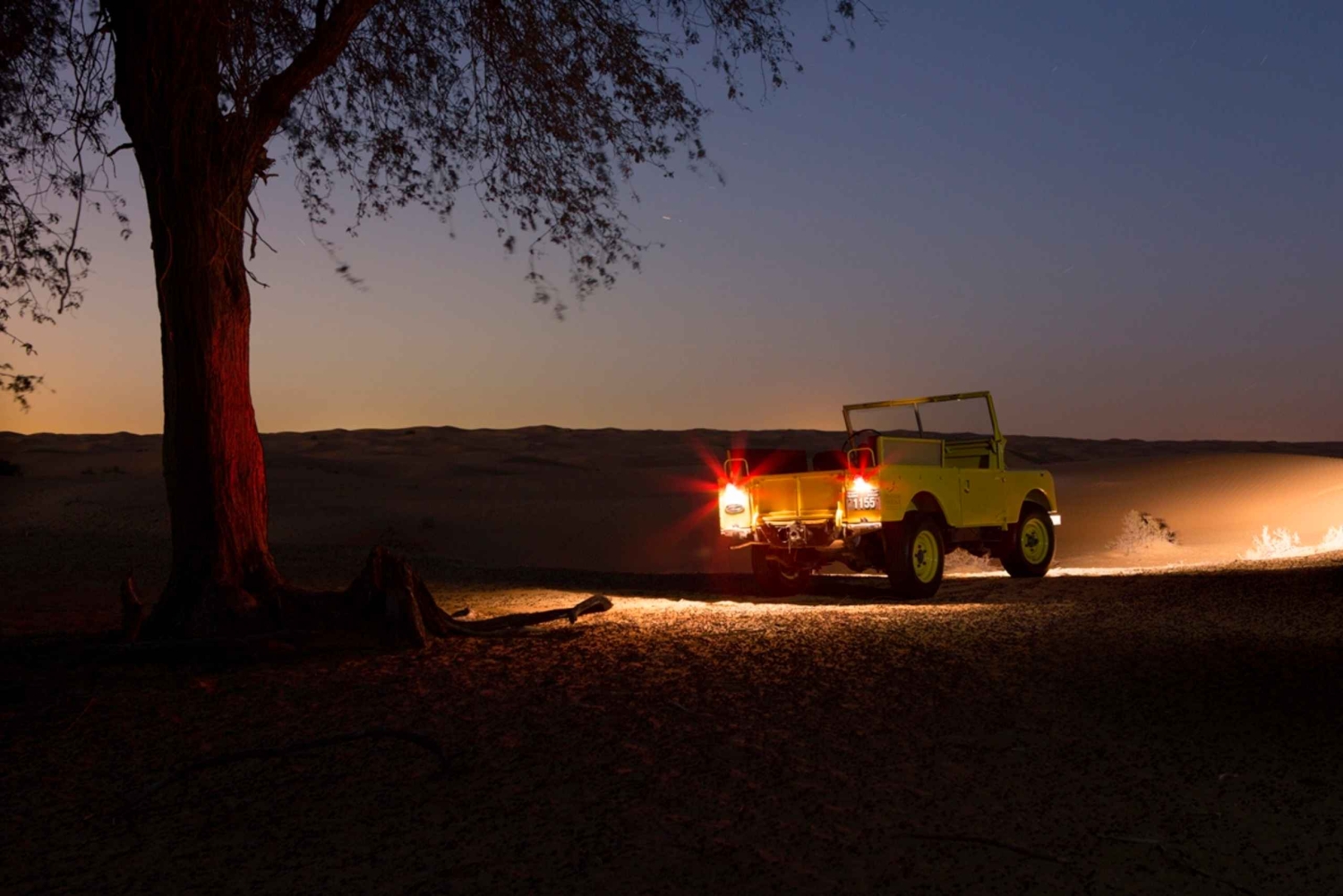 Odkryj nocną pustynię Dubaju prywatnym, zabytkowym land roverem i poszukaj nocnych zwierząt za pomocą lamp UV. Delektuj się trzydaniową kolacją i posłuchaj opowieści o gwiaździstym niebie.