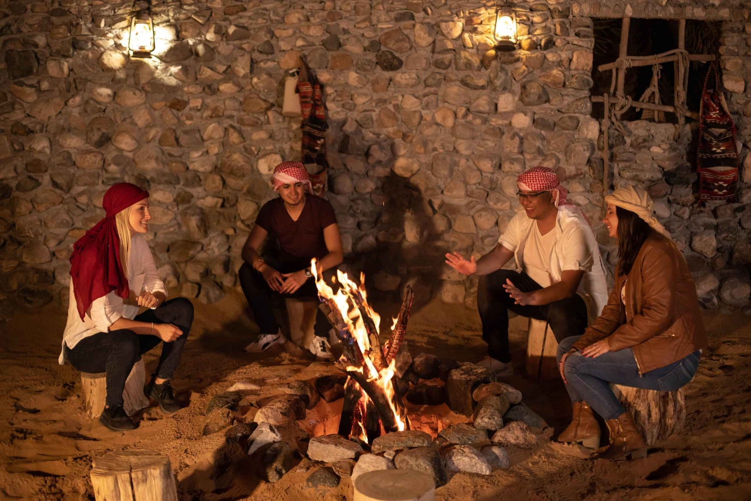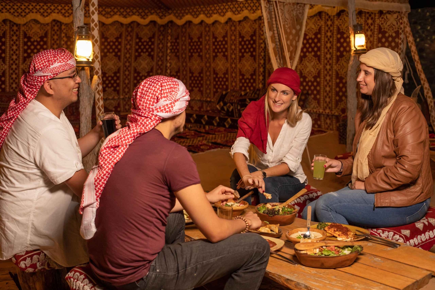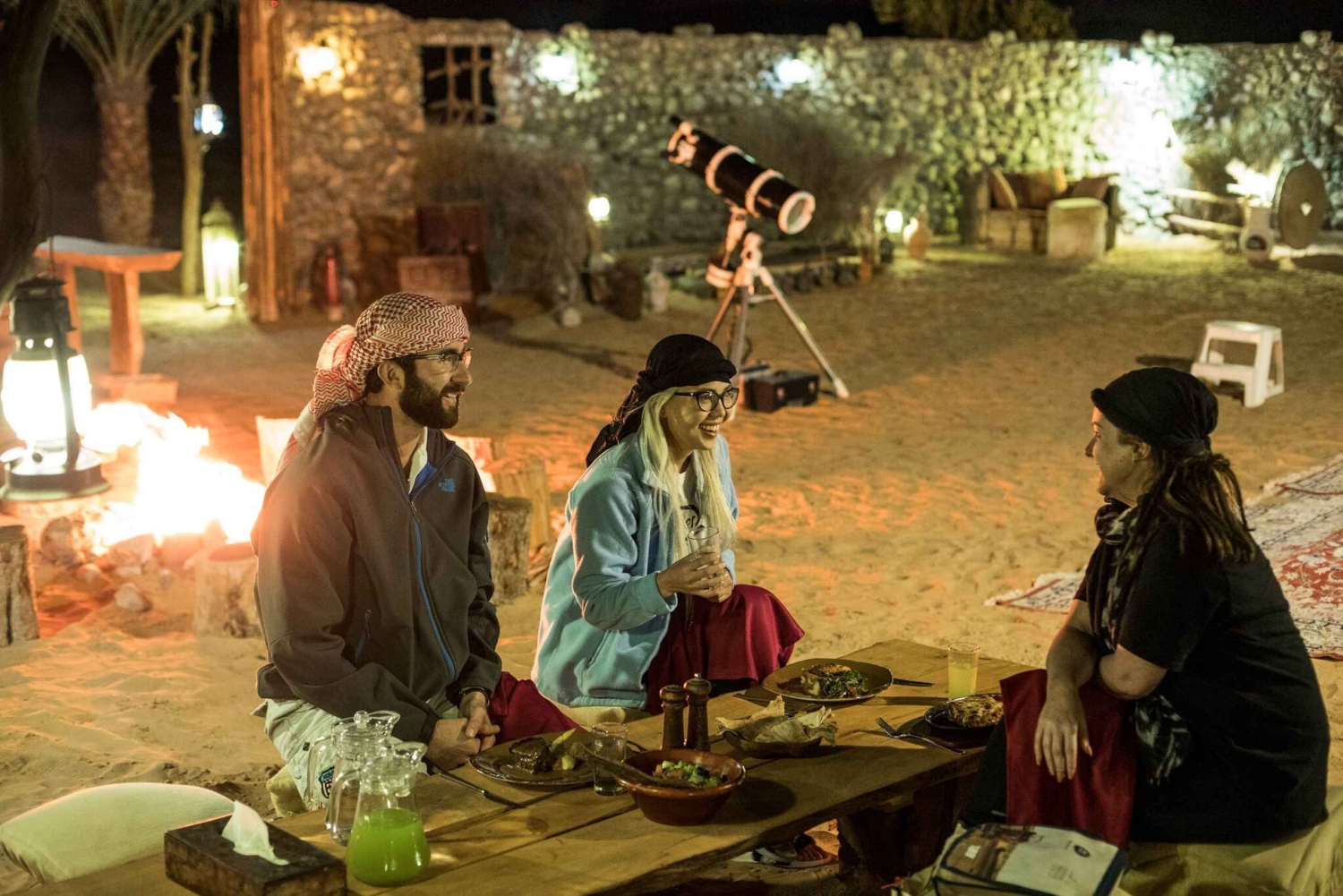 Po safari na łonie natury zrelaksuj się w obozie na świeżym powietrzu należącym do lokalnej rodziny królewskiej. Ciesz się chłodnym pustynnym powietrzem pod kocem gwiazd, podczas gdy serwowana jest trzydaniowa kolacja i napoje. Będziesz mieć również okazję wypróbować aromatyczną fajkę shisha, aby poczuć prawdziwie arabskie doznania. Wieczór zakończy się idealnie, gdy zostaniesz zabrany w podróż przez galaktyki i usłyszysz opowieści o rozgwieżdżonym niebie i tym, jak Beduini używali go do znajdowania drogi.