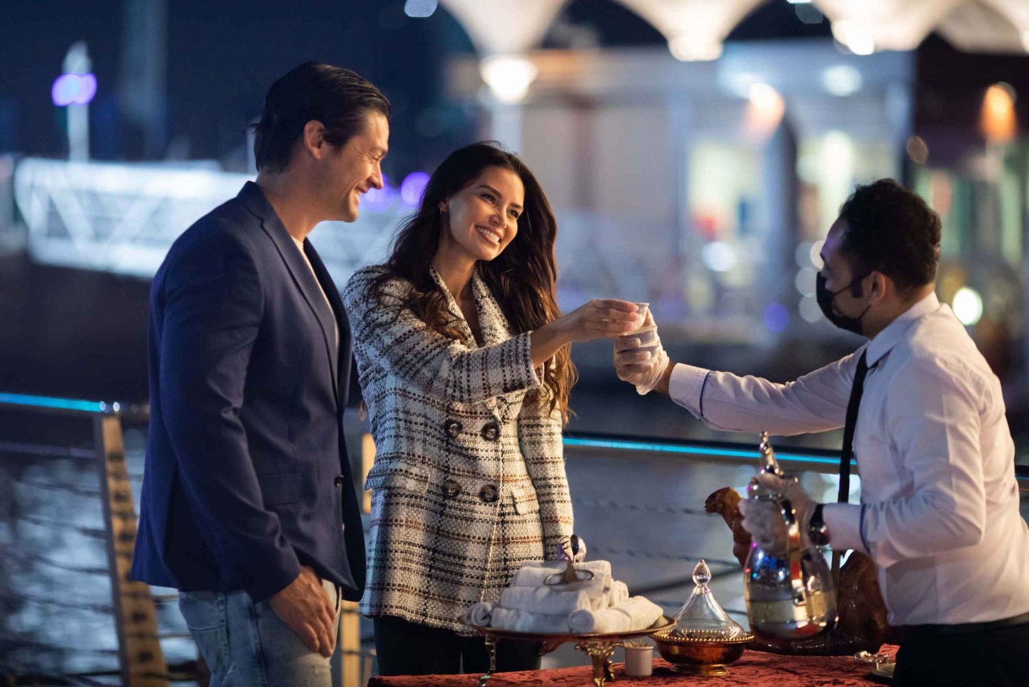 Wejdź na pokład luksusowego dau, który oferuje kolację w przeszklonej restauracji na świeżym powietrzu. W drodze do La Perle zanurz się w tętniącej życiem atmosferze miasta i przepłyń pod pierwszym w regionie mostem z wodospadem sterowanym przez czujniki, Mostem Szejka Zayeda, delektując się posiłkiem.