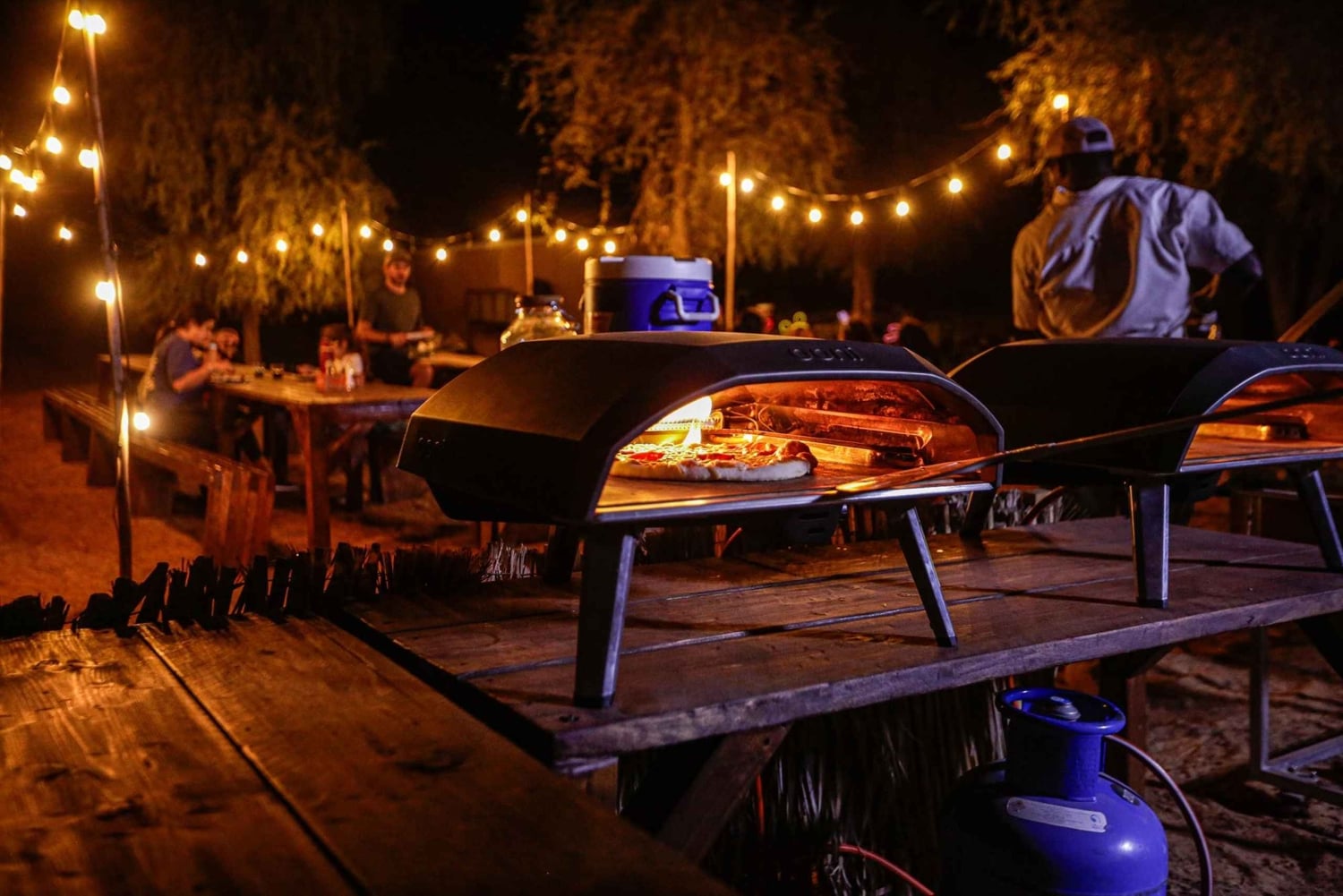As refeições são preparadas para os campistas, incluindo salada, legumes grelhados, hambúrgueres cozidos no fogo e pizza feita no forno, enquanto a roupa de cama também está pronta nas suas tendas.