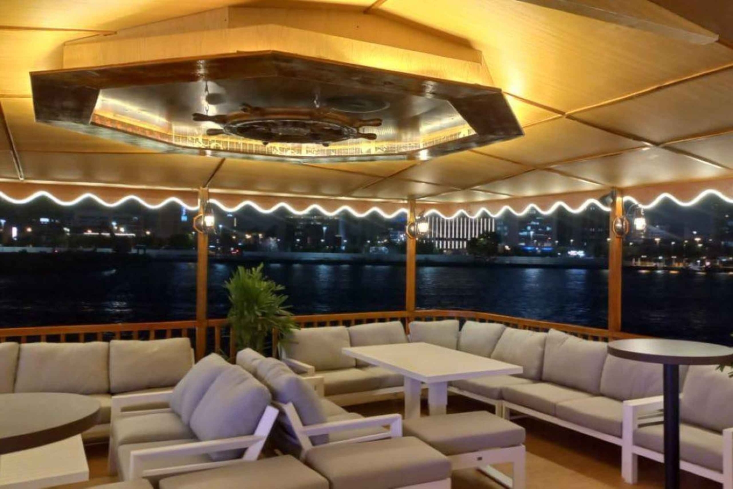 Посмотрите живое танцевальное представление Танура на лодке, а затем развлекательное кукольное представление. Слушайте фоновую музыку в стиле эмбиент. Отведайте вкусный ужин-барбекю на палубе с множеством вегетарианских и невегетарианских блюд на выбор. Выпейте также несколько безалкогольных напитков.