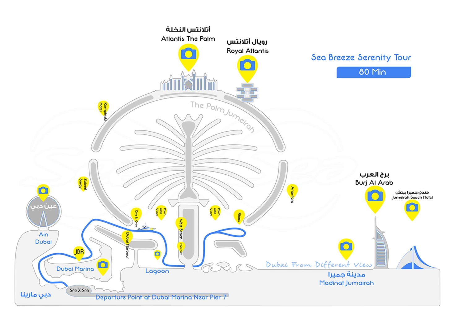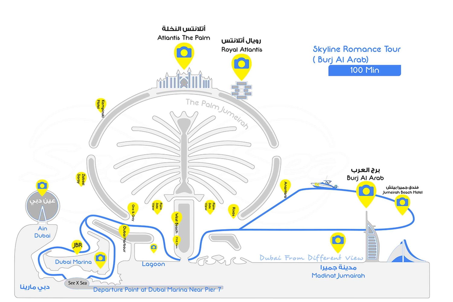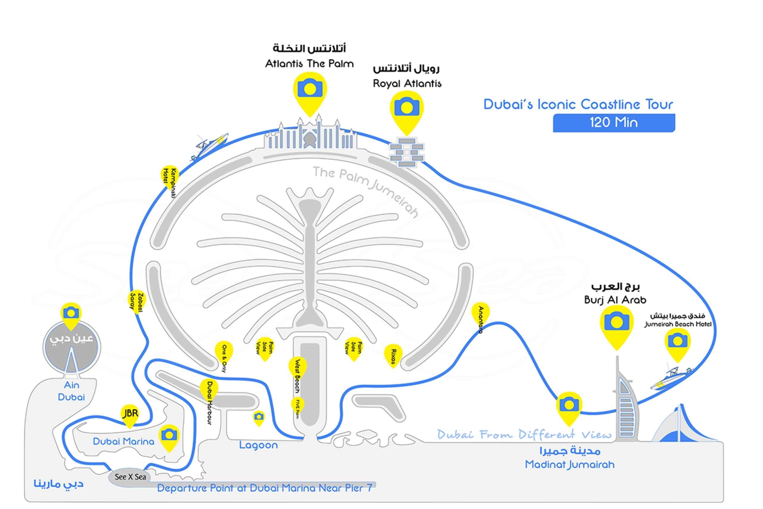 Чтобы получить полное представление о Дубае, возьмите 120-минутный тур и посмотрите Royal Atlantis и Burj Al Arab. В конце тура лодка вернется в исходную точку в Dubai Marina, где пассажиры могут сойти на берег и исследовать пристань или близлежащие достопримечательности.