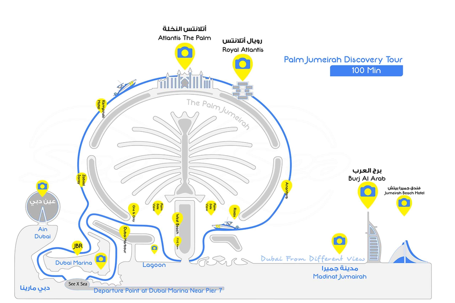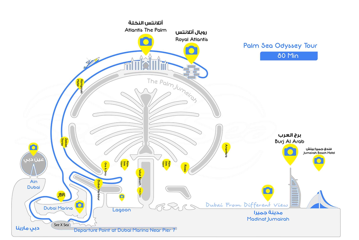 Откройте для себя знаковые достопримечательности Дубая во время круиза по Пальме Джумейра. Выберите одну из 3 продолжительностей тура и посетите Ain Dubai, Atlantis, Palm Jumeirah и сделайте фотографии панорамы Дубая.